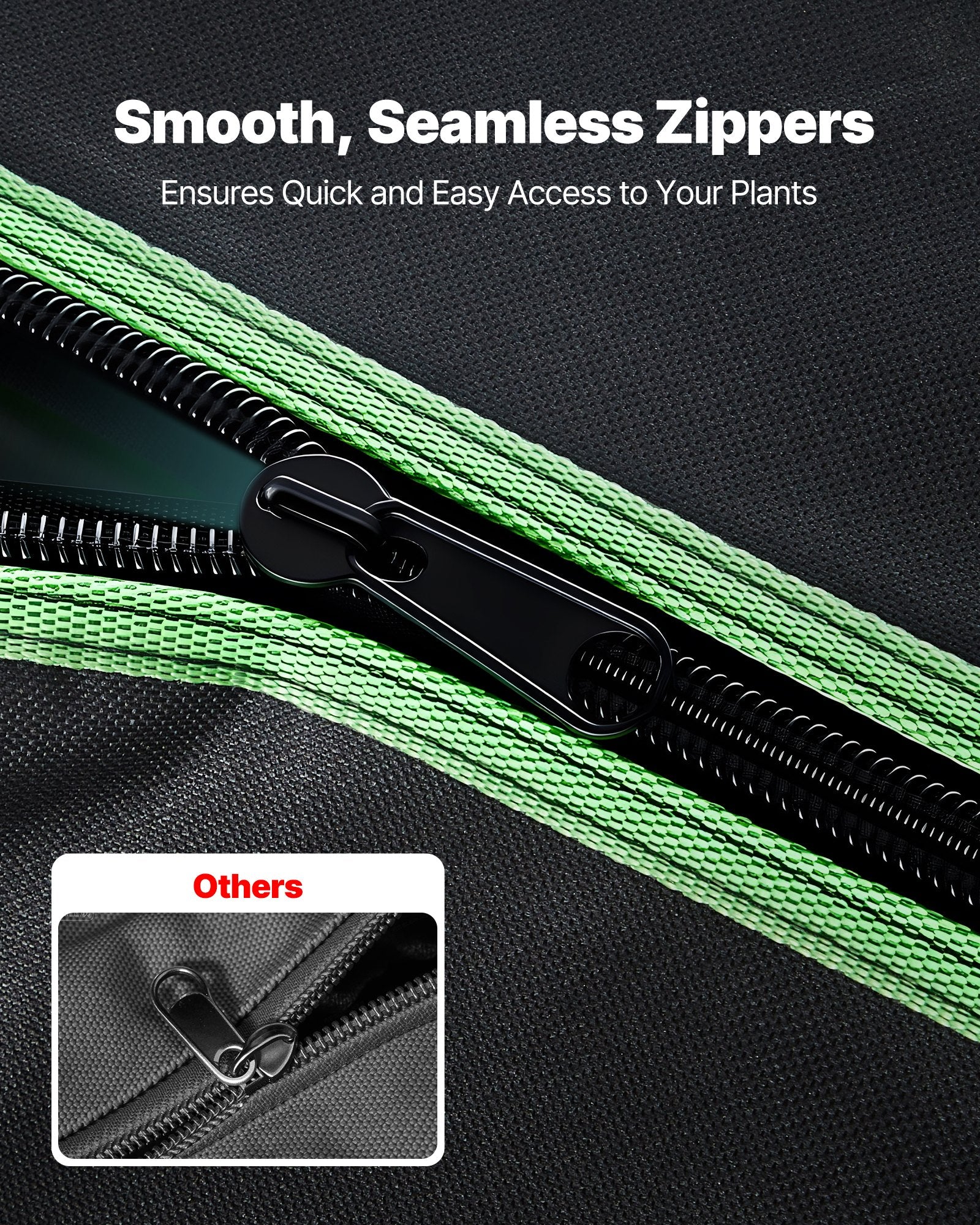 • Enkel observation och underhåll: Odlingstältet för inomhusväxter har en avtagbar bottenbricka som förhindrar fuktansamling och är lätt att rengöra. De släta dragkedjorna ger enkel åtkomst och låter dig övervaka dina växters framsteg utan att öppna tältet helt, vilket minimerar störningar.
