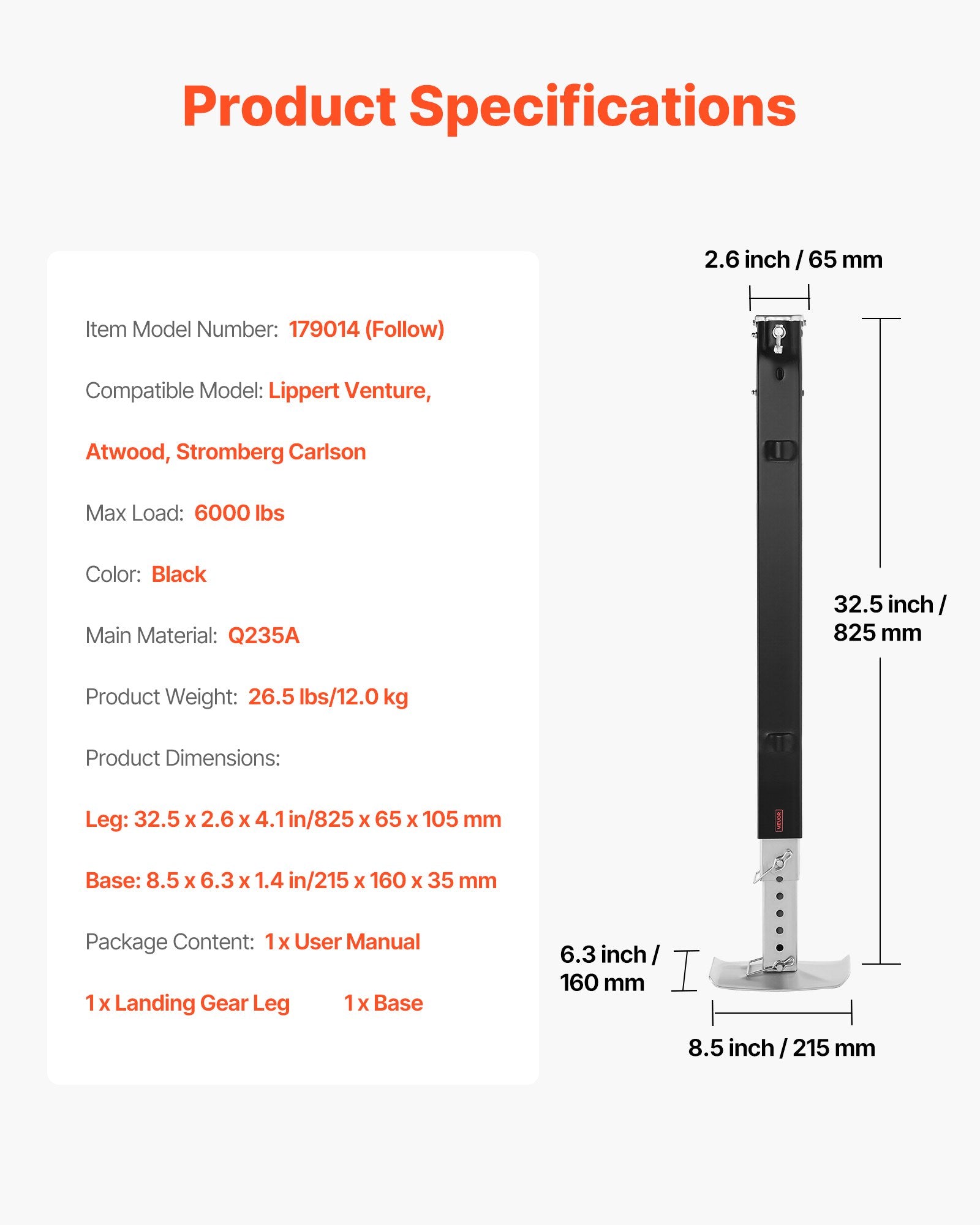 - Kompatibla modeller: Vårt reservlandningsställsben för husbilar är utformat för husbilar med femte hjul. Det passar Stromberg Carlsons landningsställssatser (LG-1, LG-3 eller LG-183708) och är kompatibelt med Lippert Venture och Atwood landningsställssystem.