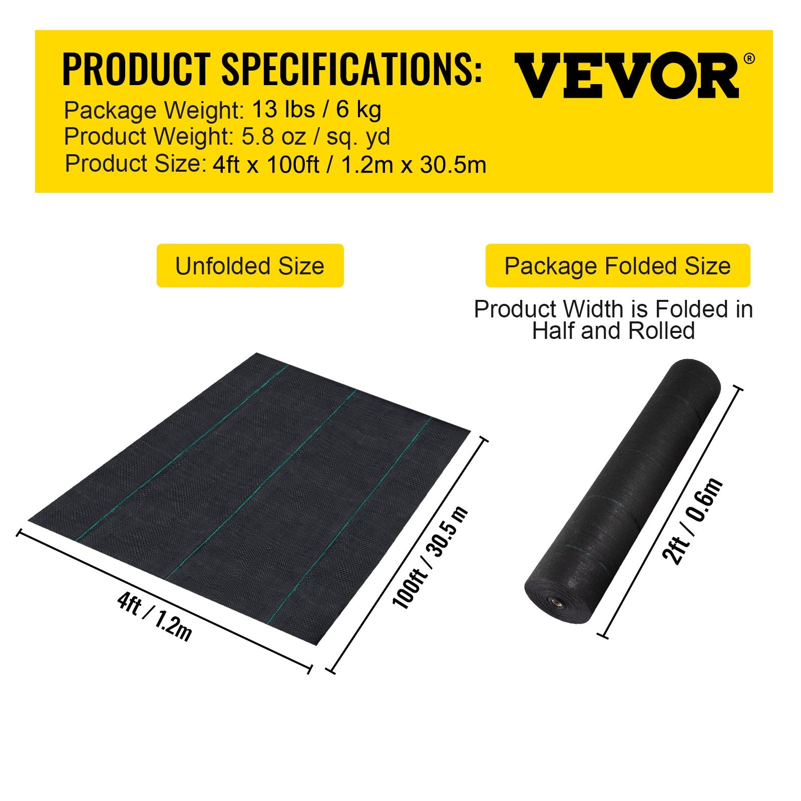 - Robust ogräsbarriärtyg: Tillverkad av 5,8 oz högdensitets-, riv- och korrosionsbeständigt vävt tyg. VEVOR 4 x 100FT vävd ogräsbarriärtyg för landskapsarkitektur är det föredragna valet för jordbruk och industri. Det säkerställer överlägset ogrässkydd och främjar markhälsan, vilket håller din landskapsarkitektur ogräsfri under en längre period.