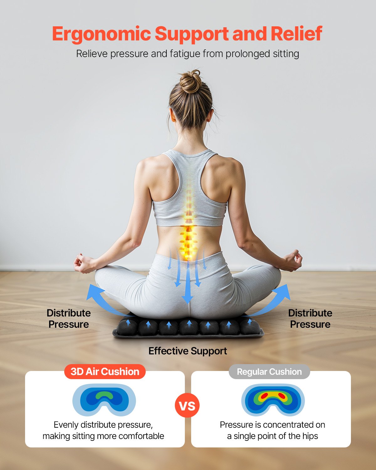 - Stödjande och tryckavlastande: Den uppblåsbara sittdynan VEVOR är utformad med 56 oberoende luftceller och ger utmärkt stöd för svanskotan, höfterna, ländryggen och ryggen, och fördelar trycket jämnt för ökad komfort under långa sittpass.