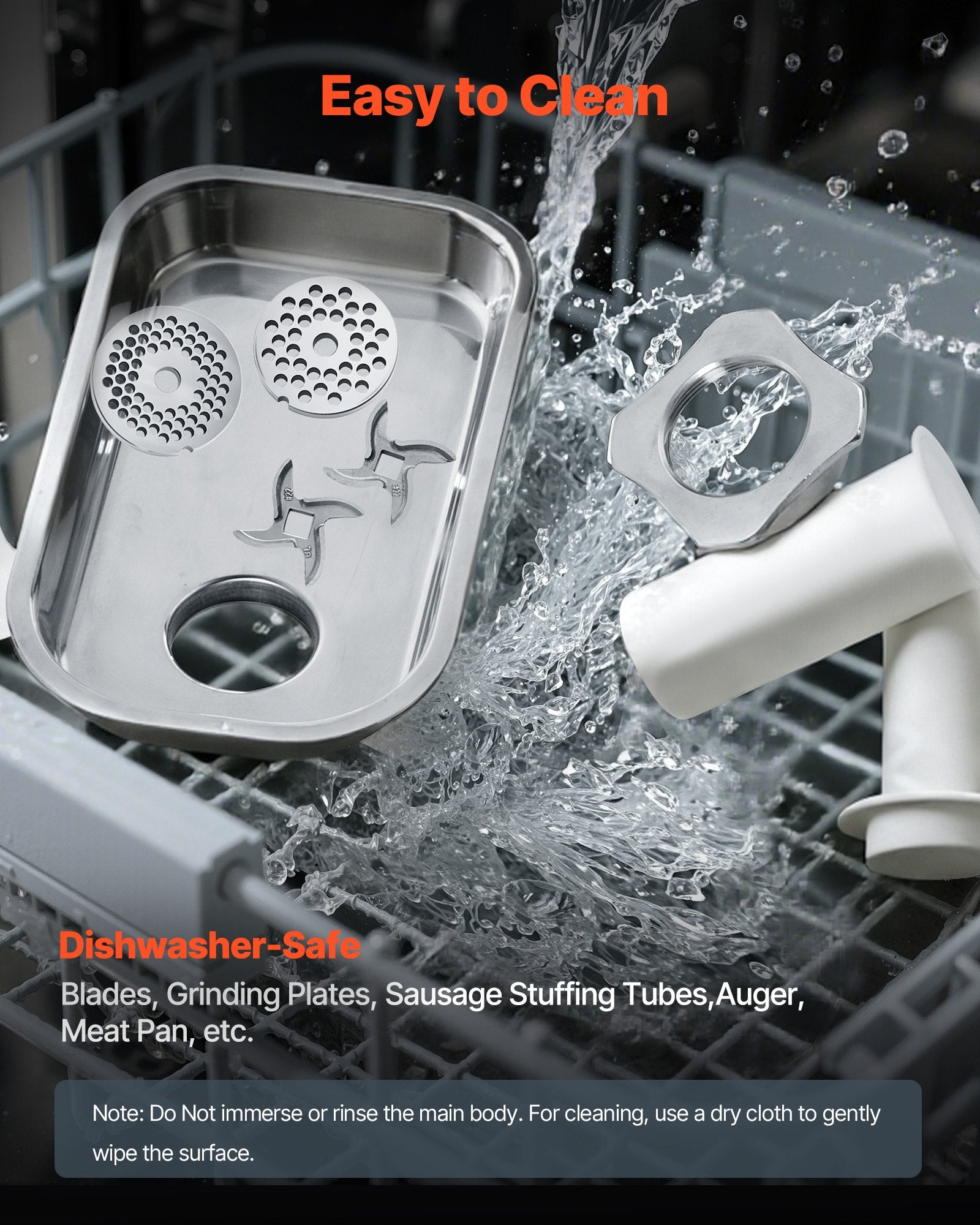 - Mångsidiga tillbehör: Maskinen levereras med två vassa köttkvarnsblad, två skärplattor, en korvstoppare och en köttstöt, så att du kan mala olika köttsorter som fläsk, nötkött, viltkött, kyckling och fisk, samt göra korv och mer.