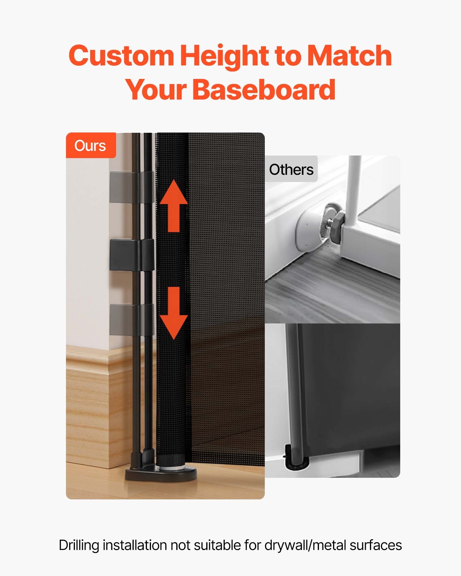 - Skadefri montering av golvlister: De nedre fästena kan justeras vertikalt, vilket gör att den infällbara hundgrinden kan monteras över golvlister utan att skadas. All monteringsdetaljer ingår för snabb och enkel installation.