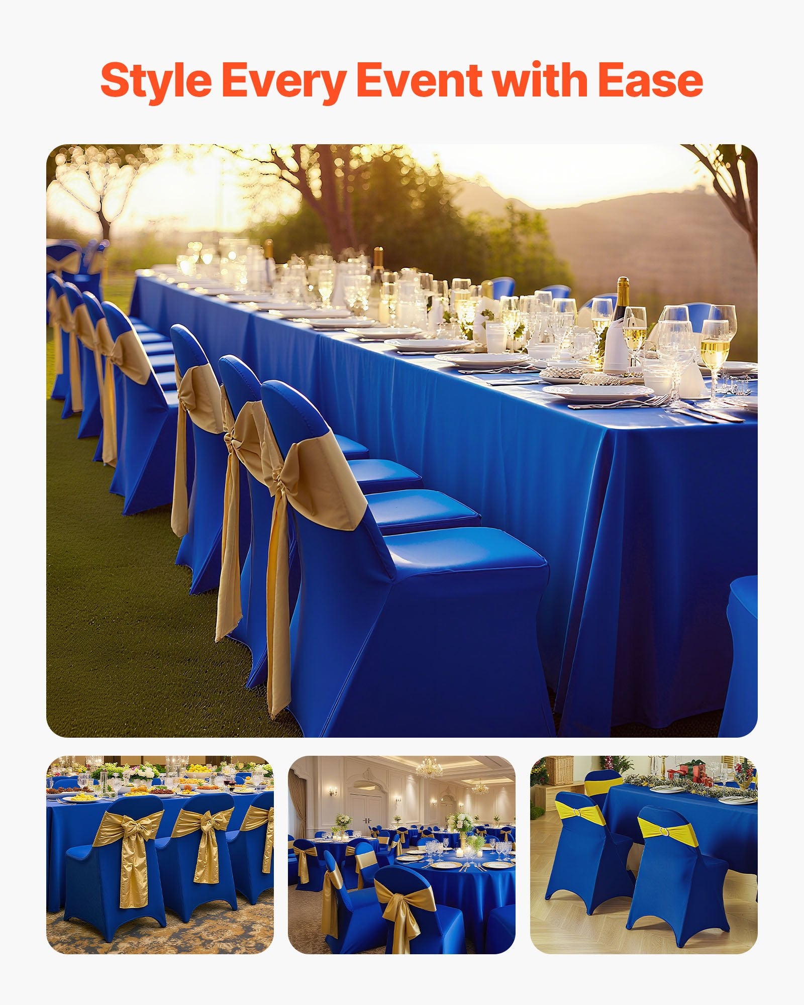 - Passande stolar och tillfällen: Dessa stolsöverdrag är perfekta för fällstolar. Du kan använda dem för att dekorera personliga och affärsmässiga evenemang, inklusive födelsedagsfester, bröllop, affärsmöten, banketter, fester etc.
