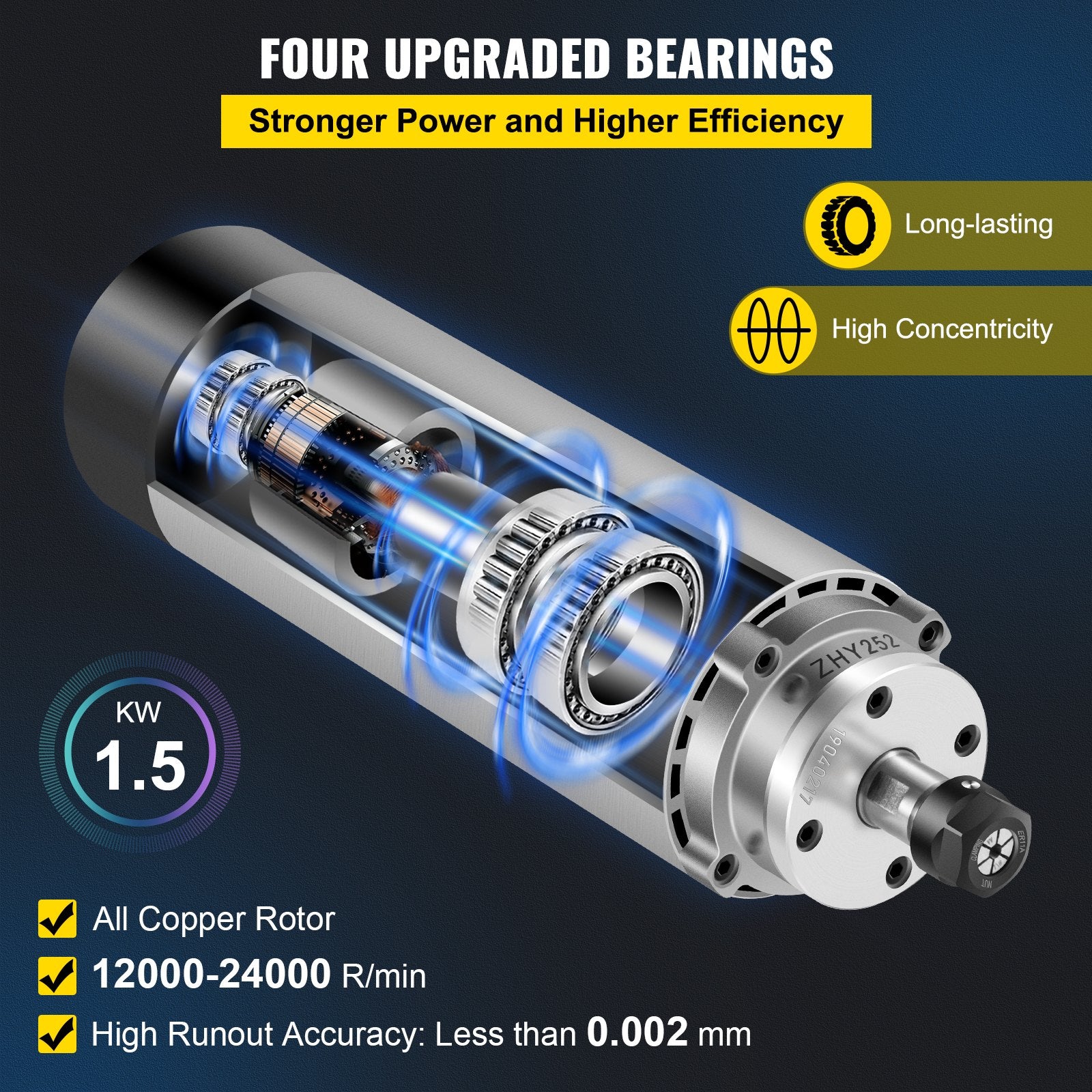 - 【TEKNISKA PARAMETRAR】- Specifikation: φ65x205 mm (Diameter: 65 mm x Längd: 205 mm), Effekt: 1,5 KW, Spänning: 220V~250V, Frekvens: 400 Hz, Hastighet: 8000-24000 r/min, Rundgång: mindre än 0,005 mm.