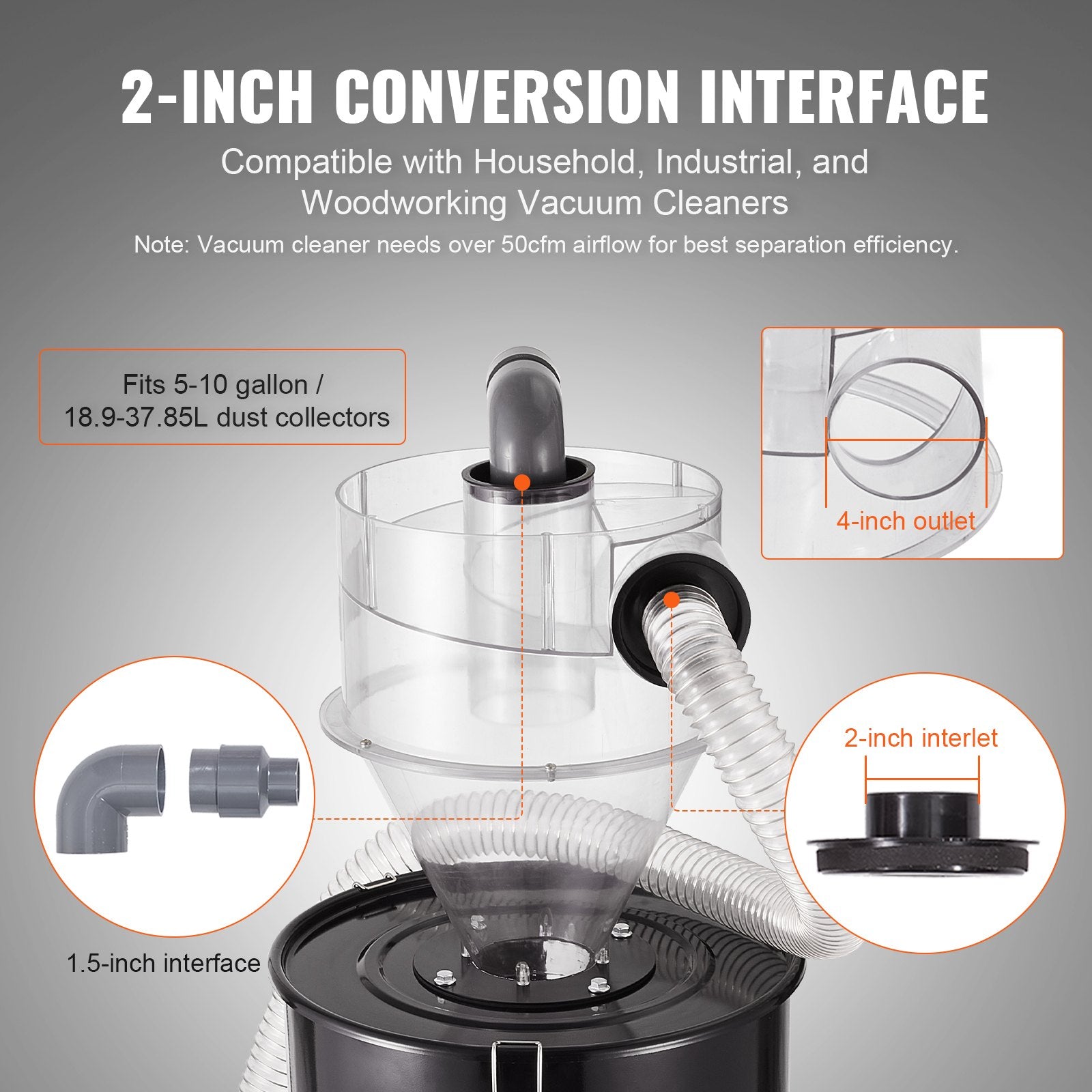 - Kompatibel med 4,0-tums/101,6 mm slangar: Dammsugarens inlopp och utlopp är utformade med en diameter på 3,81 tum/97 mm, lämplig för kommersiella dammsugslangar på 4,0 tum. Den inkluderar också en 1,97-tums/50 mm adapter, vilket gör den kompatibel med 2,0-tums hushållsdammsugslangar.