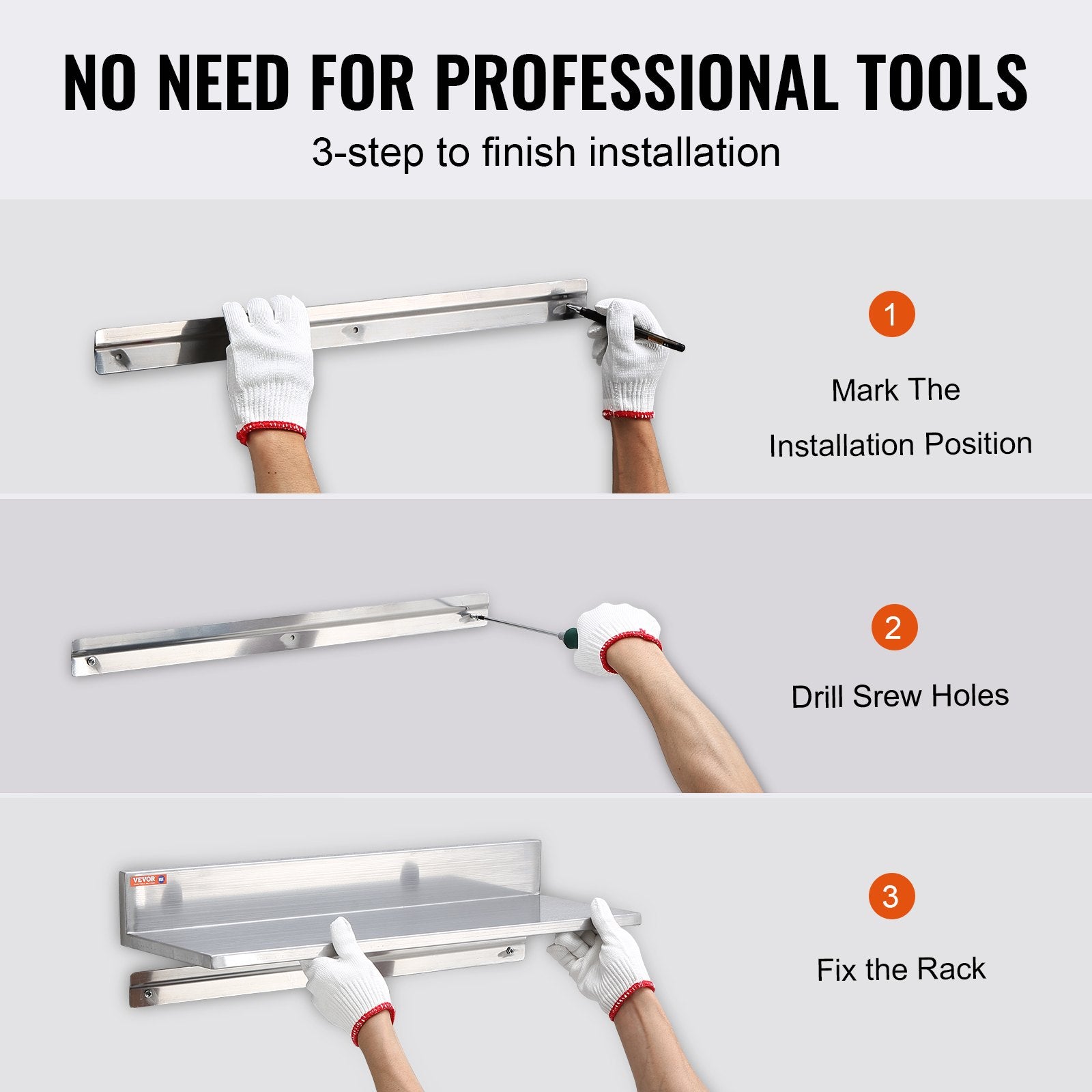 - Stabil och solid konstruktion: Vår väggmonterade hylla är tillverkad av NSF-certifierat 430 rostfritt stål, vilket garanterar hållbarhet och enklare rengöring. Ytan har en borstad behandling som är konstruerad för att motstå dagliga repor, korrosion och missfärgning. Så oroa dig inte för att mat- och vätskestänk förstör din yta.