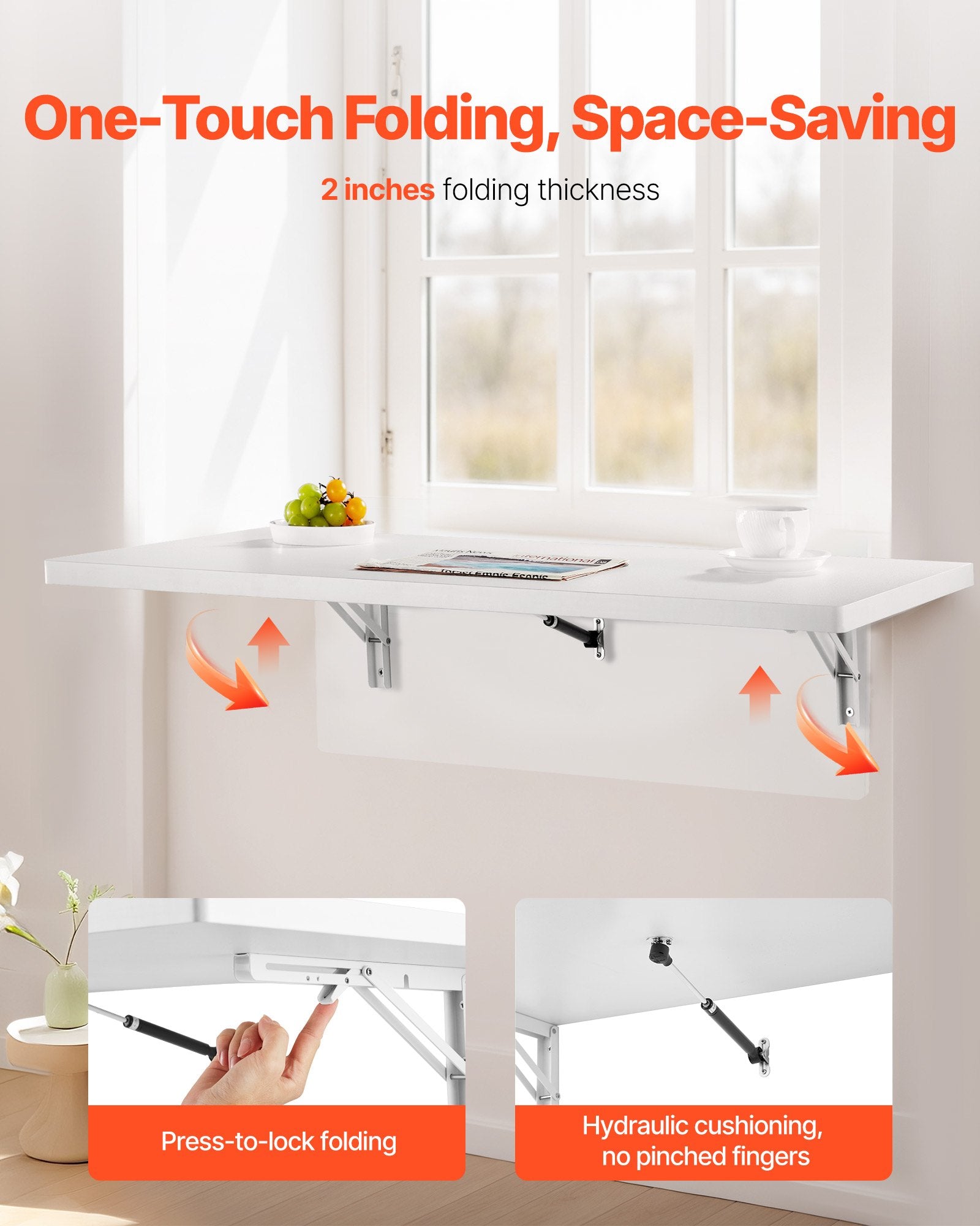 • Långsamt fällbart: Detta väggmonterade fällbord är utformat för att spara utrymme och fälls snabbt ihop och ut, perfekt för små utrymmen. De långsamt stängande fästena förhindrar klämning under användning, vilket gör det extremt bekvämt för omedelbar användning utan behov av stora reserverade utrymmen – fäll bara ut och börja arbeta eller visa upp föremål.