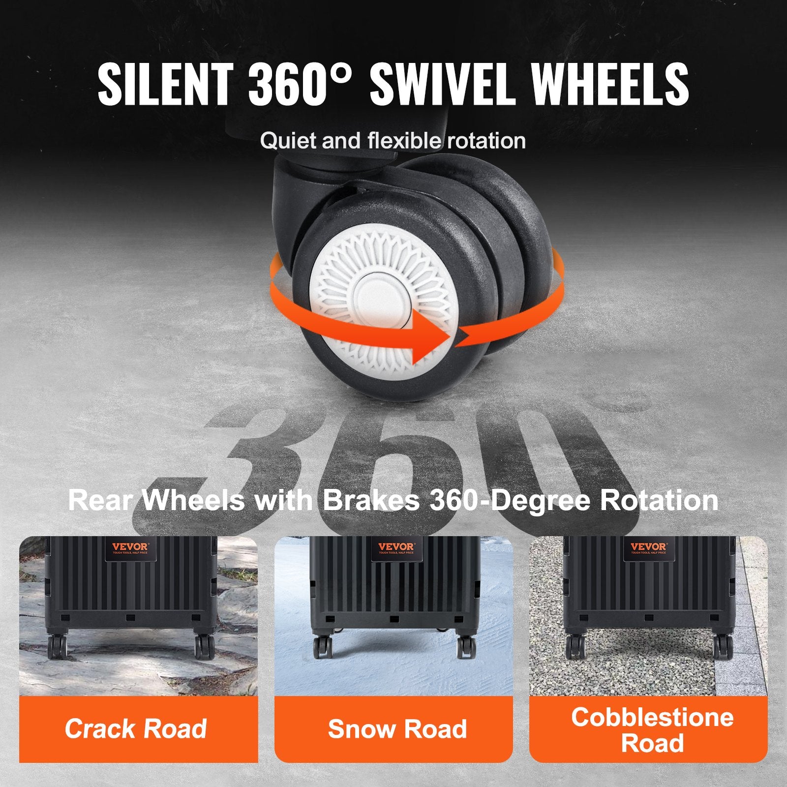 - 4-hjuls roterande design: Glöm brottningen med envisa hjul. Vår matvagn har fyra 360° ljudfria roterande hjul. Navigera i snäva kurvor och lås hjulen på plats med ett snabbt tryck på en bromsknapp. Snö eller kullersten? Inga problem!