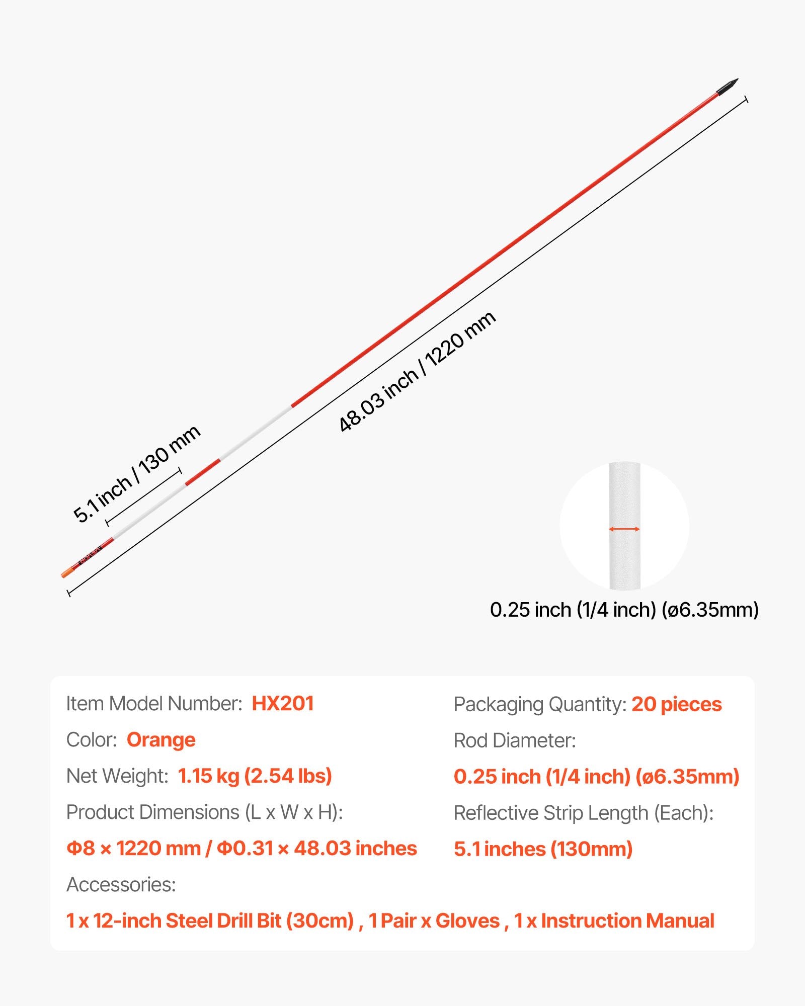 Uppfartsmarkörer, 20 st. 122 cm långa, 6,35 mm diameter, hög synlighet för uppfarten med 12-tums stålborrar, reflekterande snöpinnar, glasfiberstång för parkeringsplatser, gångvägar, snöröjning