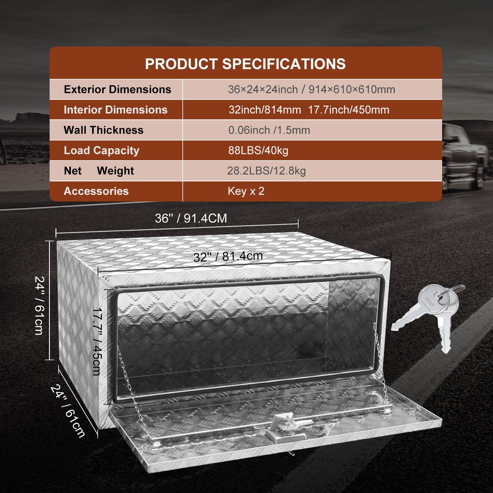 - Installera på nolltid: Denna underredesbox mäter 914 x 610 x 610 mm, så se till att mäta ditt fordons underredesutrymme innan du köper. VEVOR erbjuder en mängd olika dimensioner för att möta dina behov. Du kan också köpa fästen för installation eller göra en gör-det-själv-montering. Observera att om du monterar lastbilsboxen på fordonet, se till att stänga av strömmen för att förhindra kortslutning.