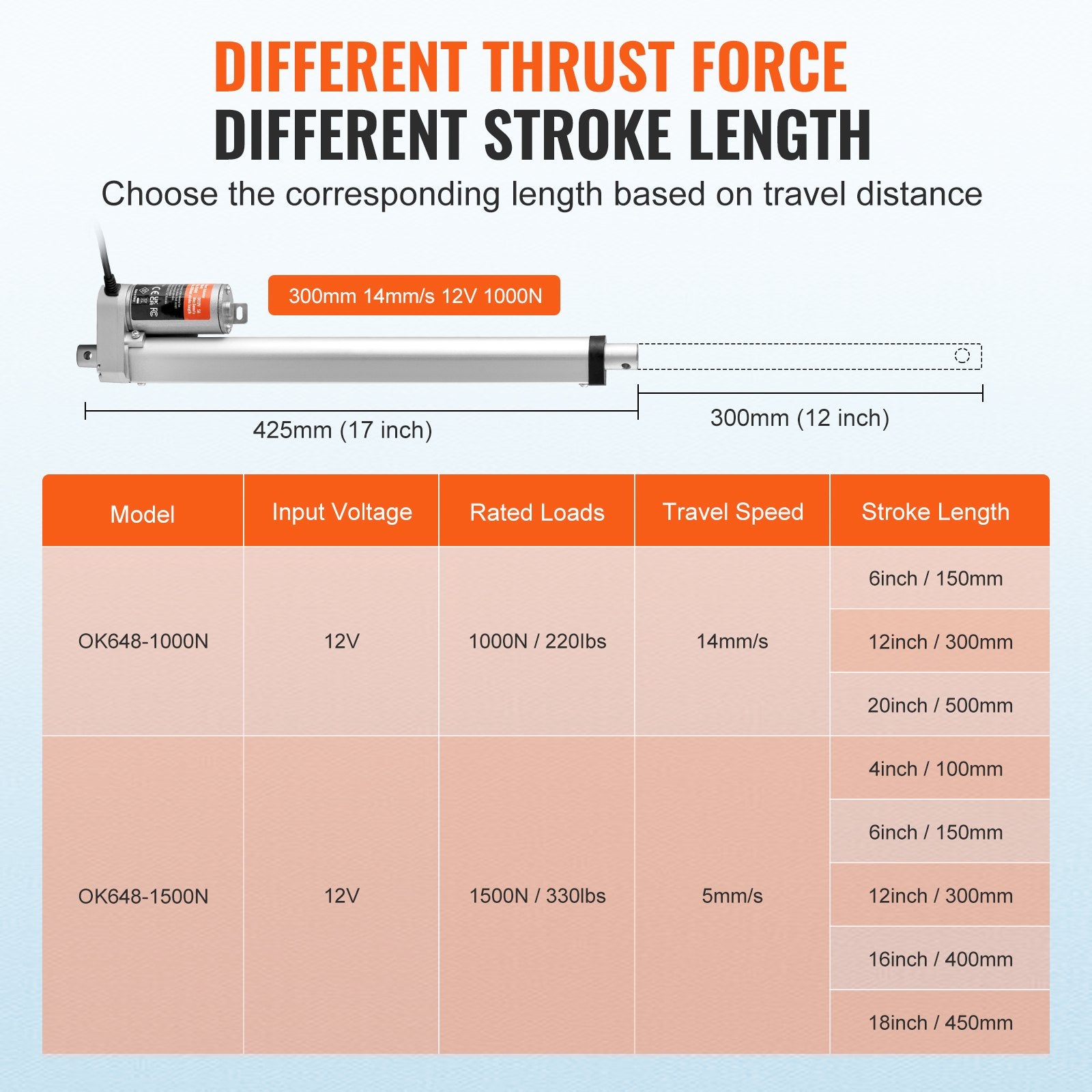 • Viktiga specifikationer: Slaglängd: 300 mm (12 tum); Rörelsehastighet: 14 mm/s (0,55 tum/s); Indragen längd: 425 mm (16,73 tum); Utdragen längd: 725 mm (28,73 tum); Strömförbrukning: 5 ampere; Nominell spänning: 12 V DC; Intermittenscykel: 25 %.