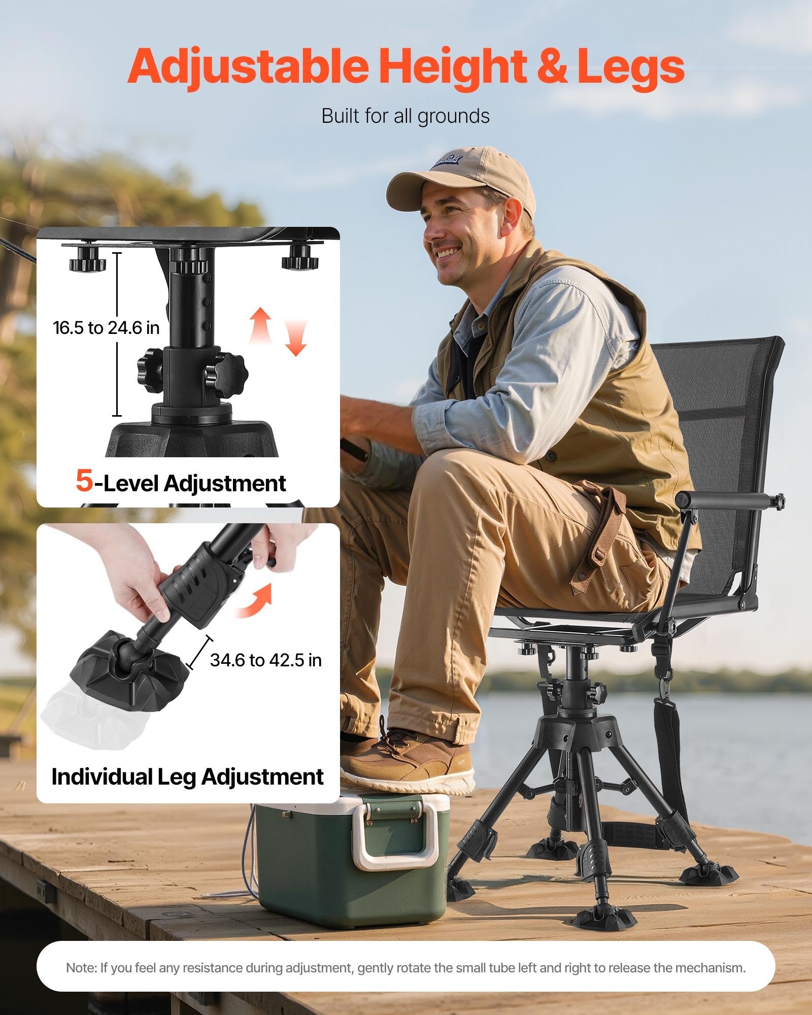 - Anpassningsbara höjdinställningar: Denna justerbara jaktstol har 4 justerbara ben (89–122 cm) och 5 sitthöjdsnivåer (40–61 cm), vilket gör att du får bättre sikt och komfort i olika terränger och utomhusmiljöer.