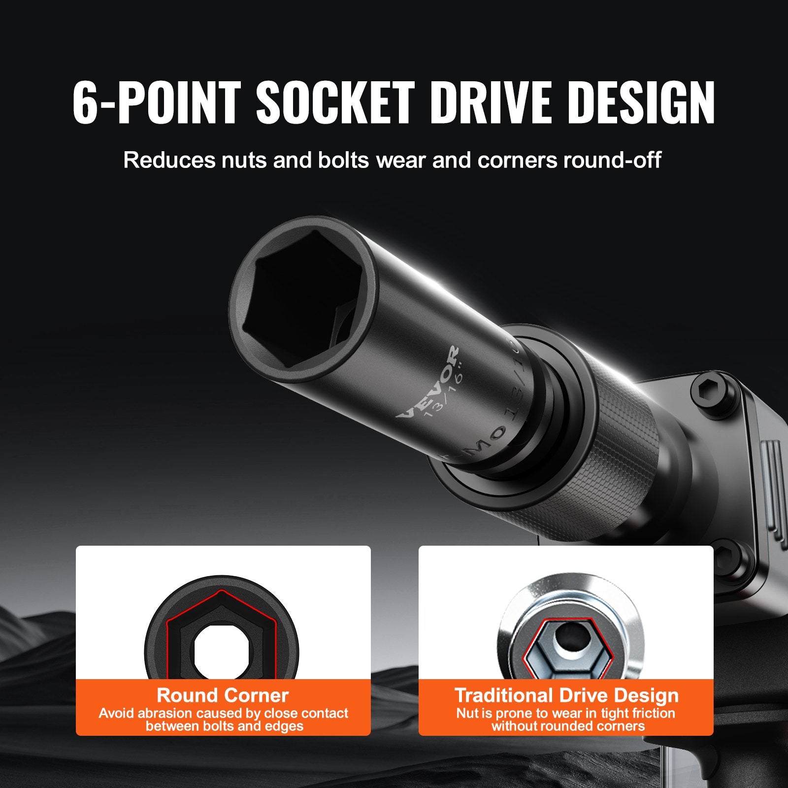 - Högt vridmoment: Denna hylsnyckelsats kännetecknas av sin sexkantiga drivdesign, vilket skiljer den från traditionella konstruktioner utan rundade hörn, och minskar avsevärt trycket på fästelementen vid slag. Som ett resultat minimerar den slitage och förhindrar effektivt rundning och avrivning av bultar.