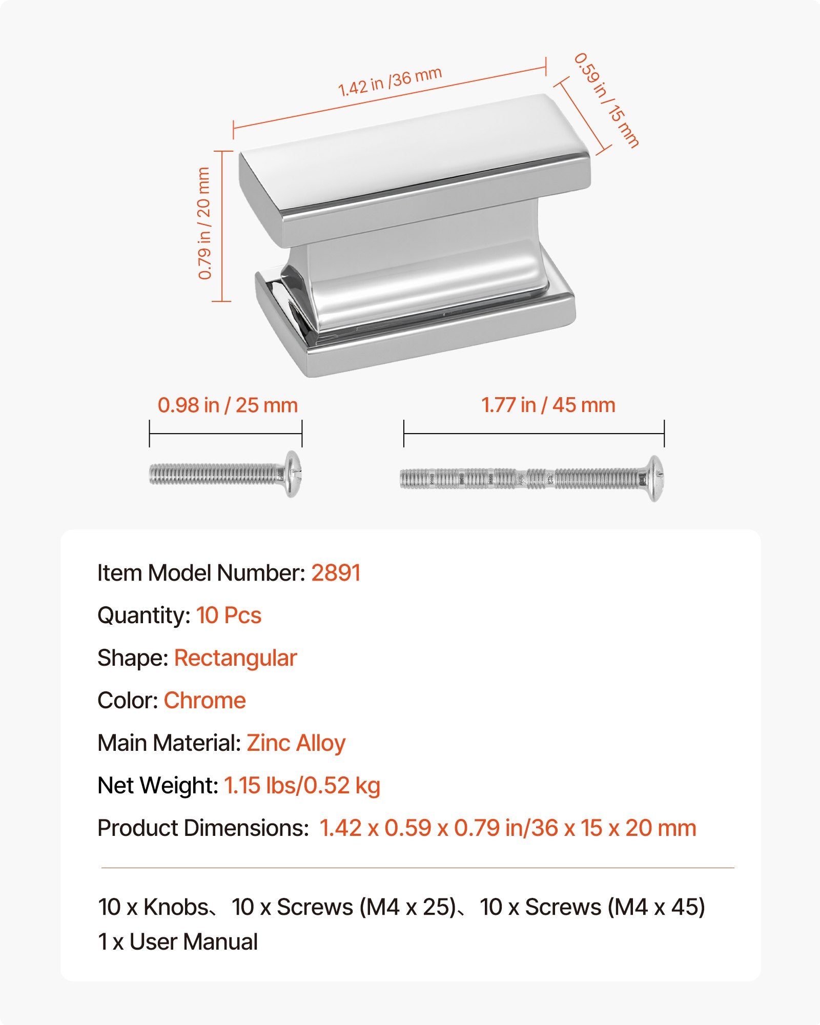 Skåpknoppar, 10-pack, 36 mm lådhandtag i zinklegering, rektangulära solida knoppar för köksbyrå, skåpbeslag med skruvar för badrumsskåp, lådor, kromfärg