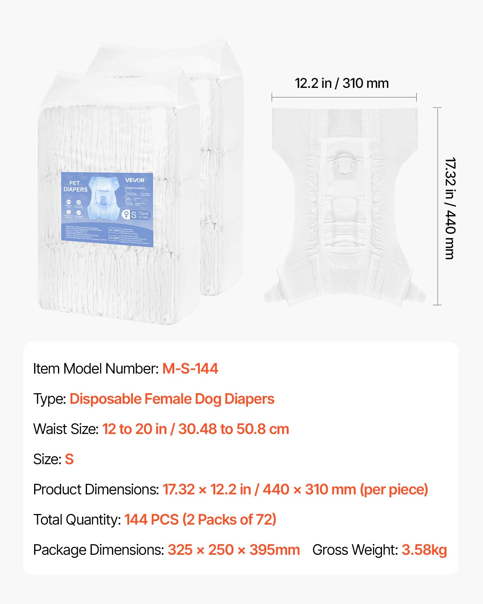 - Superabsorberande: VEVOR engångsblöjor för tikar i S-storlek har en superabsorberande kärna som snabbt låser in vätska och erbjuder 360° läckagesäkert skydd utan återflöde. Perfekt för hundar i löpcykler, husdjursträning, inkontinens, återhämtning efter operation och resor. Lämplig midjemått: 12-20 tum / 30,48 - 50,8 cm
