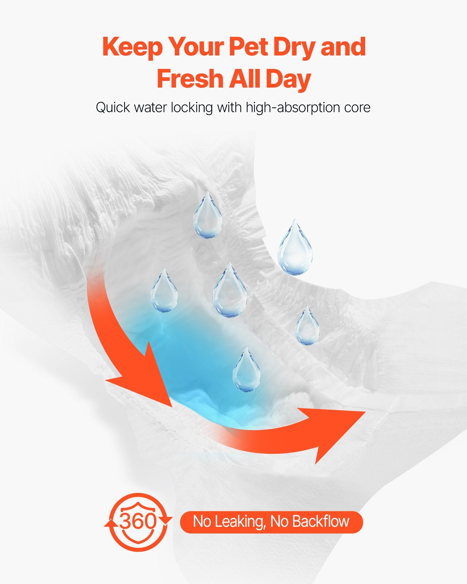- Superabsorberande: VEVOR engångsblöjor för tikar i S-storlek har en superabsorberande kärna som snabbt låser in vätska och erbjuder 360° läckagesäkert skydd utan återflöde. Perfekt för hundar i löpcykler, husdjursträning, inkontinens, återhämtning efter operation och resor. Lämplig midjemått: 12-20 tum / 30,48 - 50,8 cm