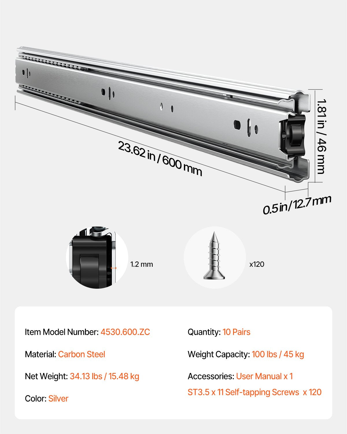 Lådskenor, 24 tum, 10 par fullutdragbara kullagerskenor för skåp, 100 LB lastkapacitet kraftiga sidomonterade lådskenor, lådskena för kök gör-det-själv-byte