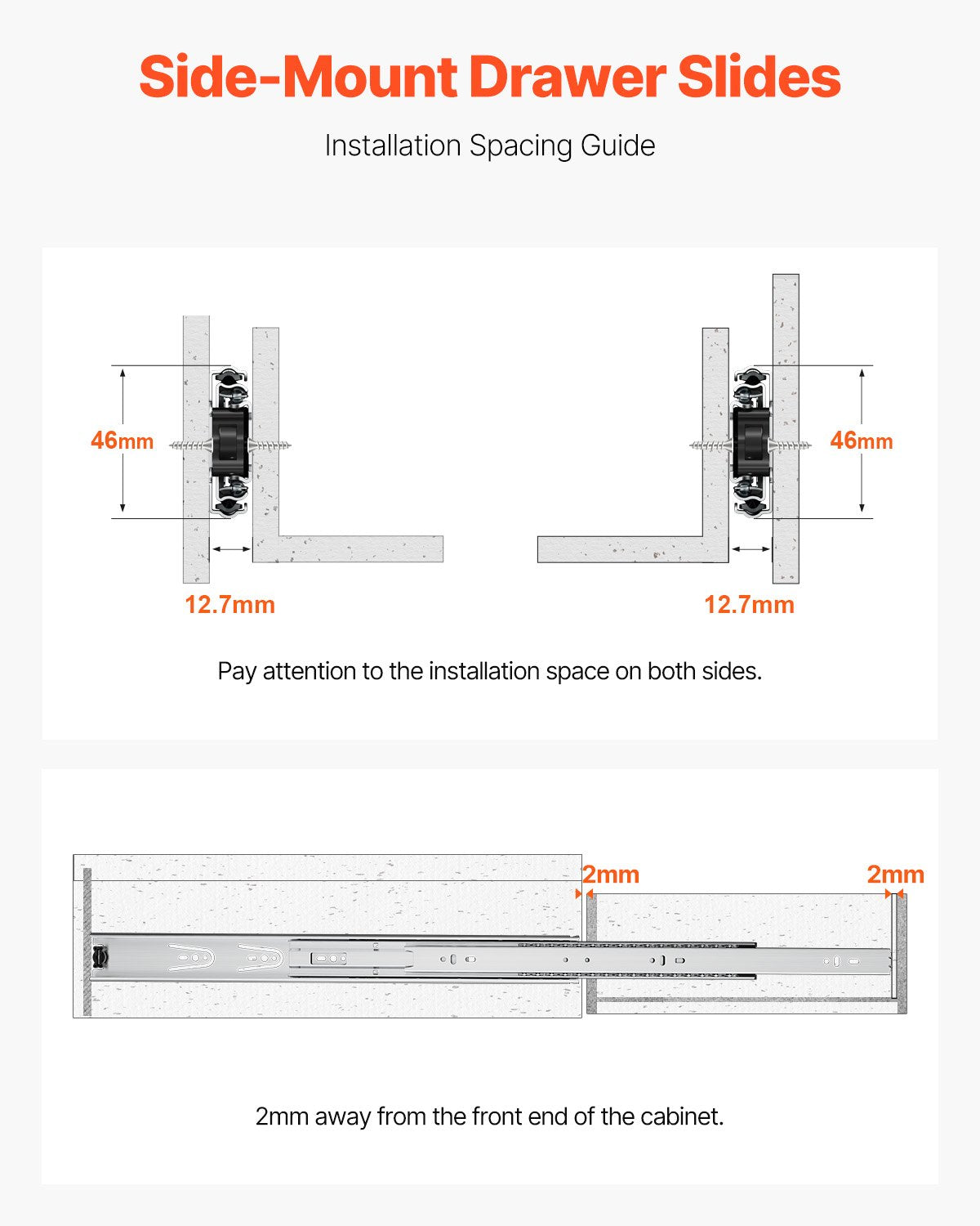 - Installationsguide: Våra sidomonterade lådskenor är utformade för att hantera vanliga installationsutmaningar. Den specialdesignade installationsavståndsguiden säkerställer ett avstånd på 2 mm från skåpets framsida, vilket gör installationsprocessen enklare och förhindrar onödiga problem.