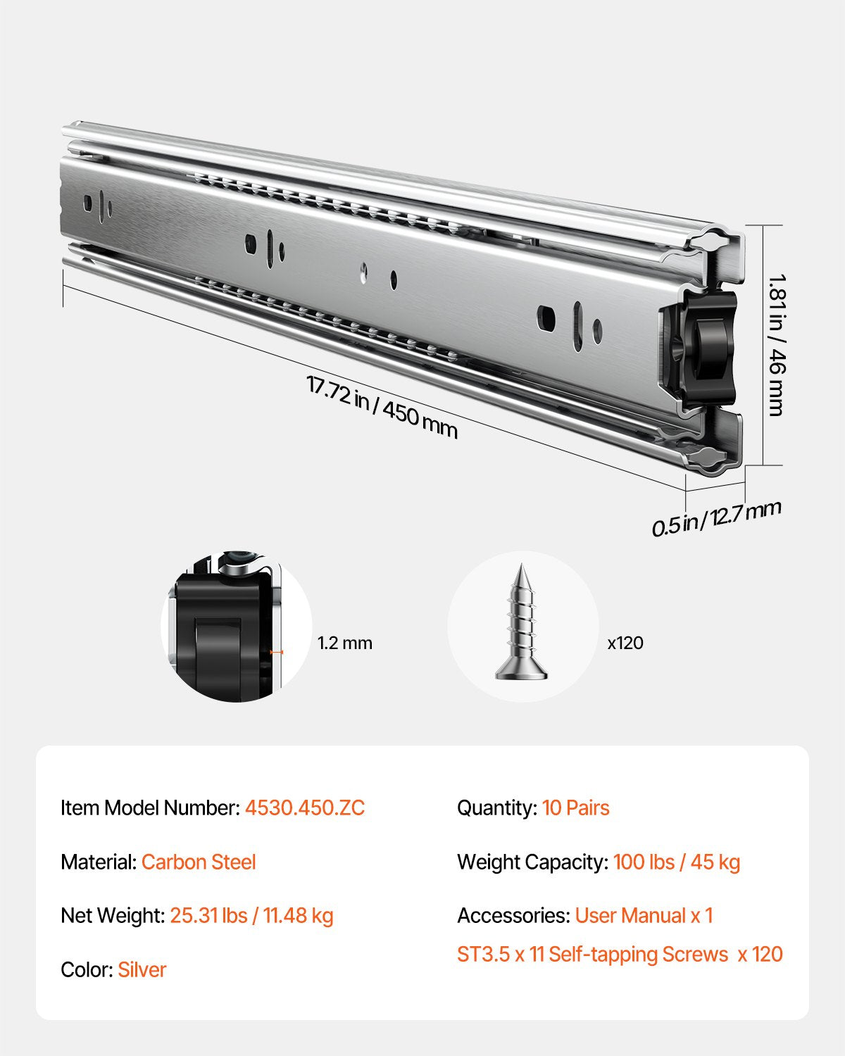 Lådskenor, 18 tum, 10 par fullutdragbara kullagerskenor för skåp, 100 LB lastkapacitet kraftiga sidomonterade lådskenor, lådskena för kök gör-det-själv-byte