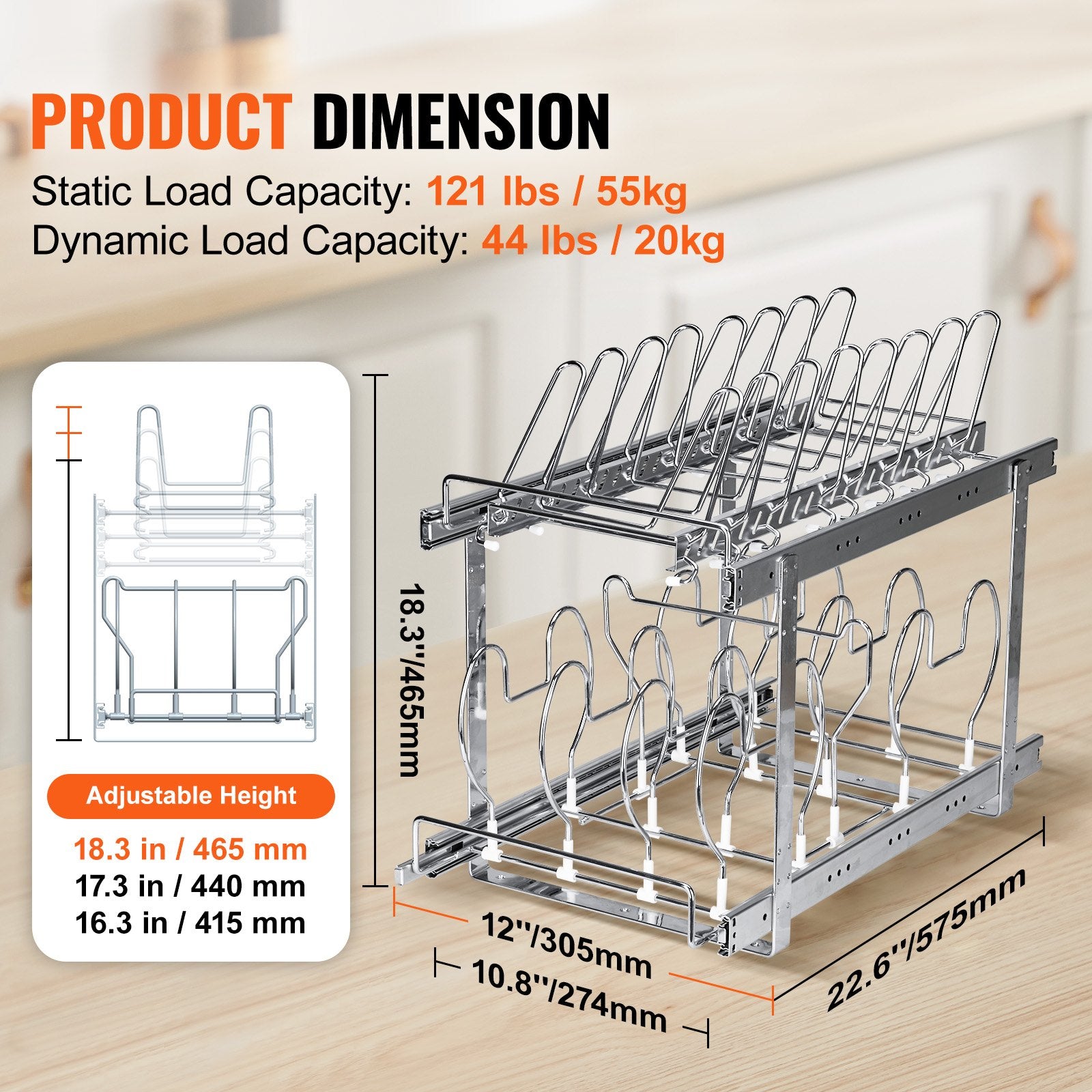 - Rymligt förvaringsutrymme: Redo att säga adjö till ditt stökiga kök med vårt stek- och kastrullställ. Denna skjutbara köksskåpsorganisatör kan hålla stekpannor, bakformar, serveringsbrickor, skärbrädor och lock, vilket gör dem lättillgängliga.