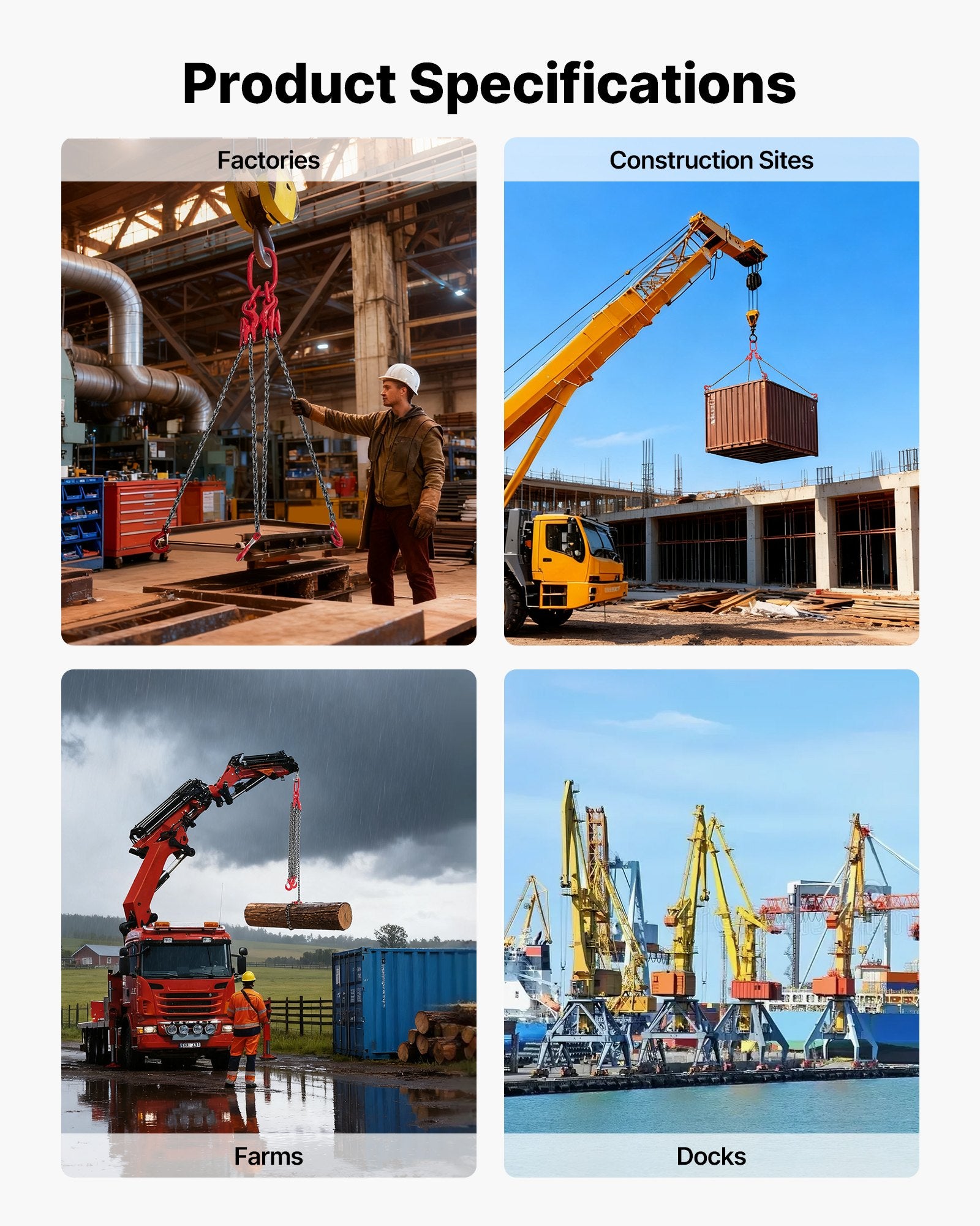 - Mångsidig användning: Denna 4-parts kättingrem är idealisk för byggarbetsplatser, fabriker, lager, mekanisk transport, varvsindustrin och tunga lyftprojekt. En mångsidig kedja för en mängd olika uppgifter.