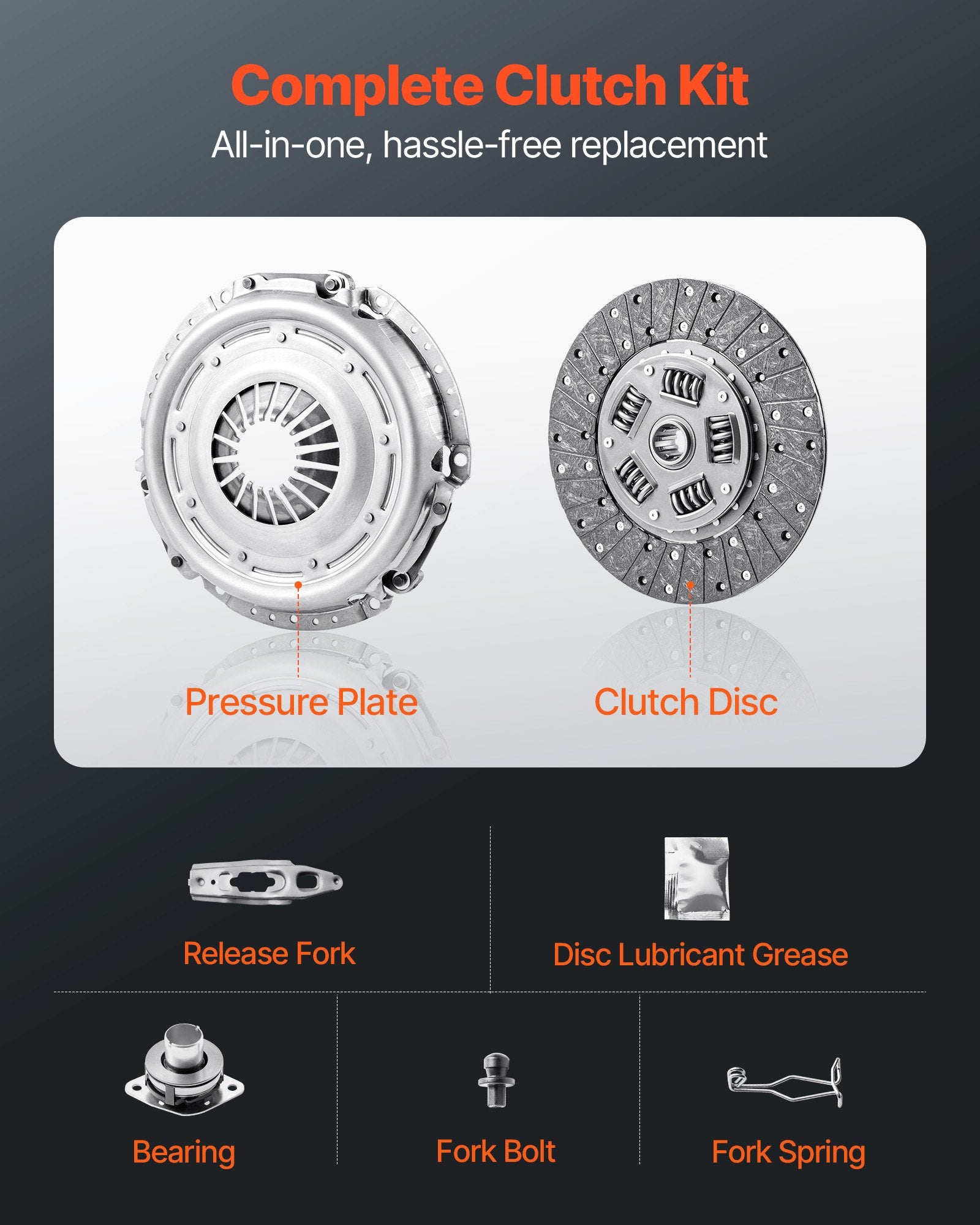 - Allt-i-ett-kit: Satsen innehåller tryckplatta, kopplingslamell, skivsmörjmedel, urtrampningsgaffel, gaffelbult, gaffelfjäder och lager – allt du behöver för att byta ut den. Slipp besväret med att leta efter extra delar och få ditt kopplingssystem reparerat på en gång.