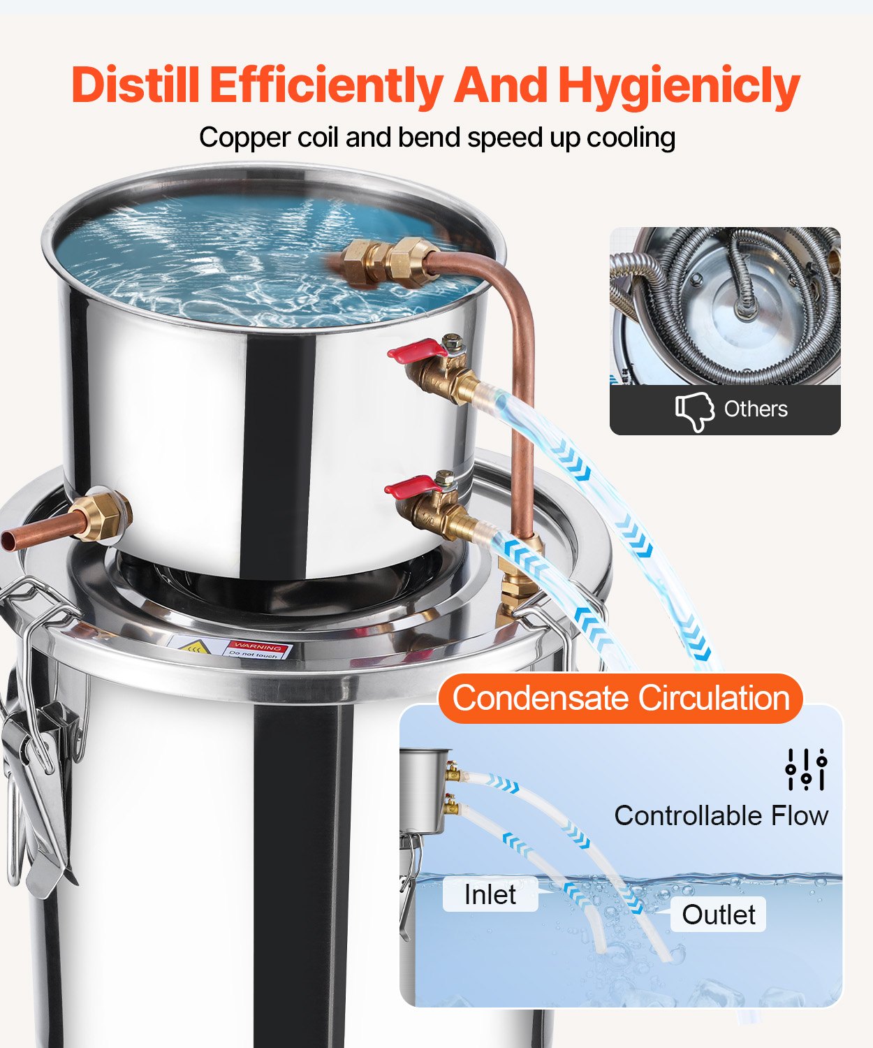 - Kylning med kopparspiral: Kyl- och destillationsprocessen använder kopparrör med god värmeledningsförmåga för effektiv kylning. Rörens släta och skrynkelfria insida förhindrar rester av destillerad alkohol och vatten, vilket säkerställer att det inte finns någon eftersmak. Vatteninlopps- och utloppsventilerna kan styra flödeshastigheten och kylhastigheten.