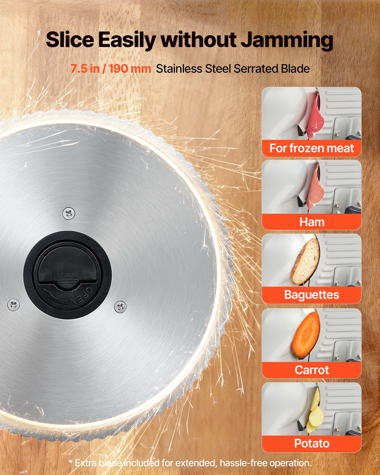 - Efficient Meat Cutting: This high-end meat slicer is equipped with a 190 mm (7.5 in) durable, sharp blade and powered by a 200W motor. With slicing speeds of 70-100 RPM, it ensures smooth, even cuts without jamming