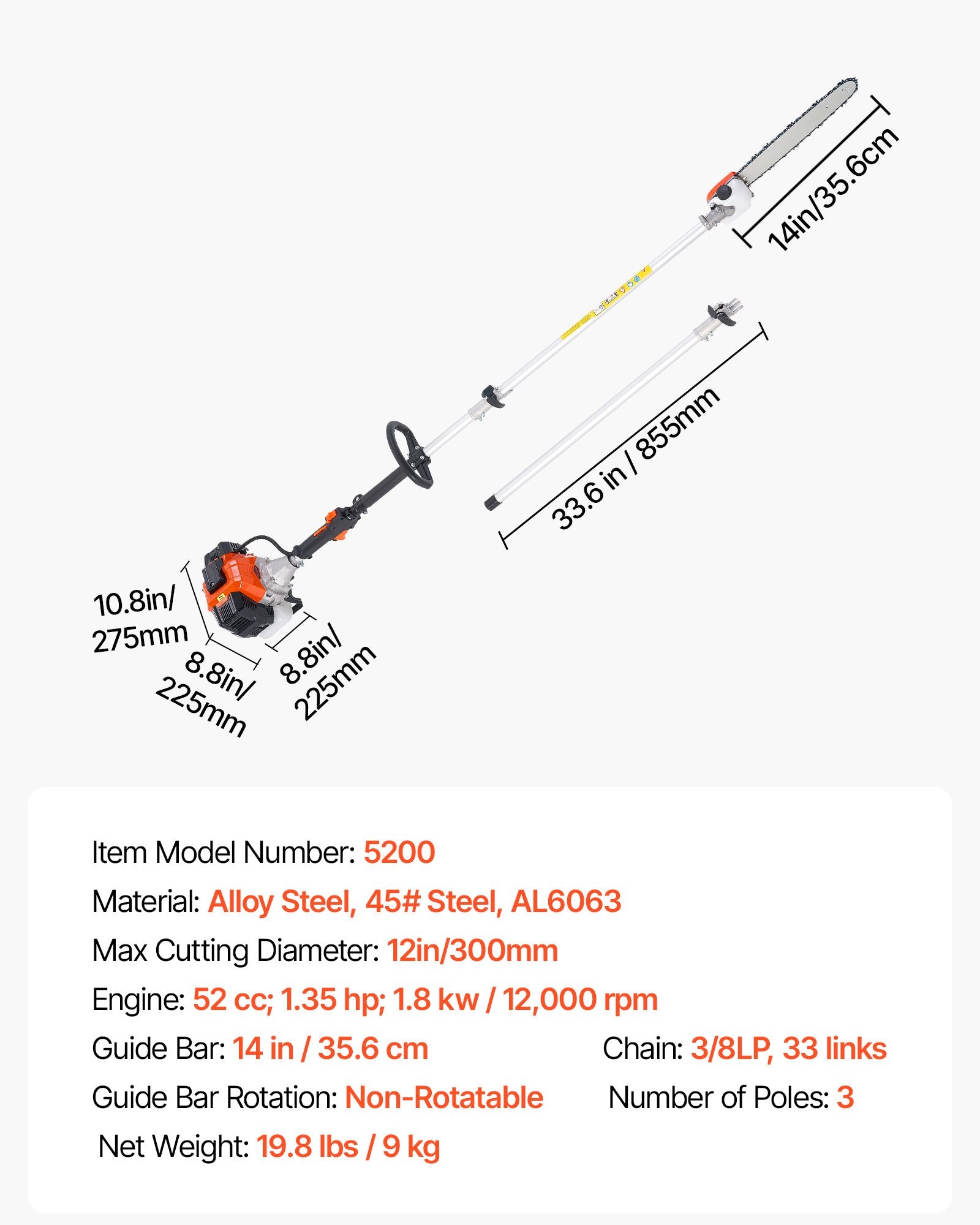- Kraftfull prestanda: Utrustad med en 52 cc 2-takts bensinmotor, levererar den bensindrivna stångsågen 1,35 hk och når upp till 12 000 varv/min, perfekt för snabb grenkapning. De två 85,5 cm långa förlängningsstängerna sträcker sig från 2,2 m till 2,94 m för att enkelt kunna ta sig an grenar på olika höjder.