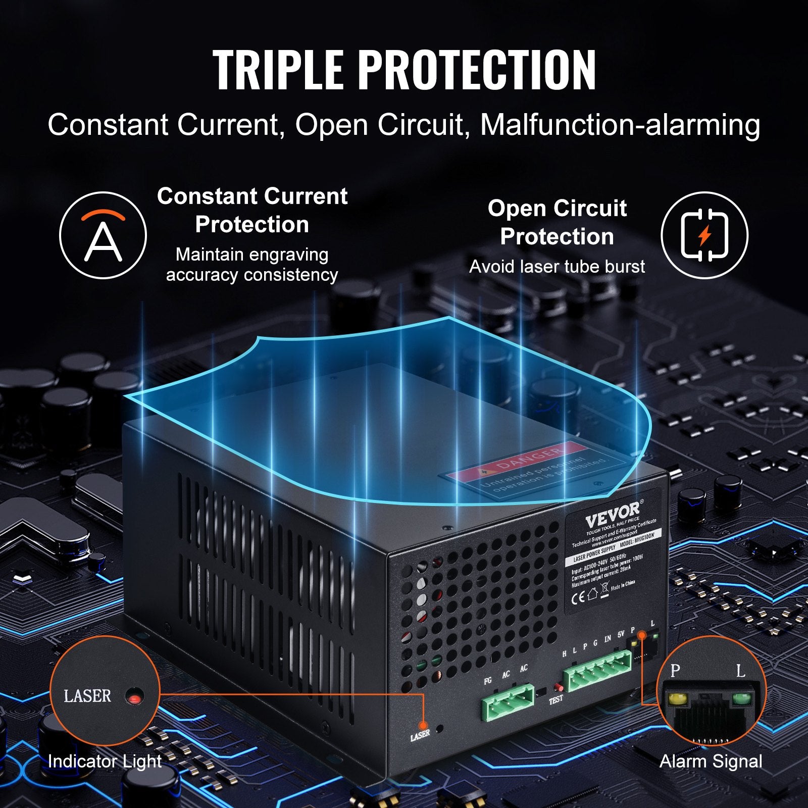 - Kompatibel med 100W laserrör: Laserströmförsörjningen som är speciellt framtagen för lasergraveringsmaskiner är perfekt kompatibel med olika märken av 100W laserrör. Portarna är tydligt markerade med motsvarande etiketter, så du kan enkelt slutföra anslutningen enligt anvisningarna.