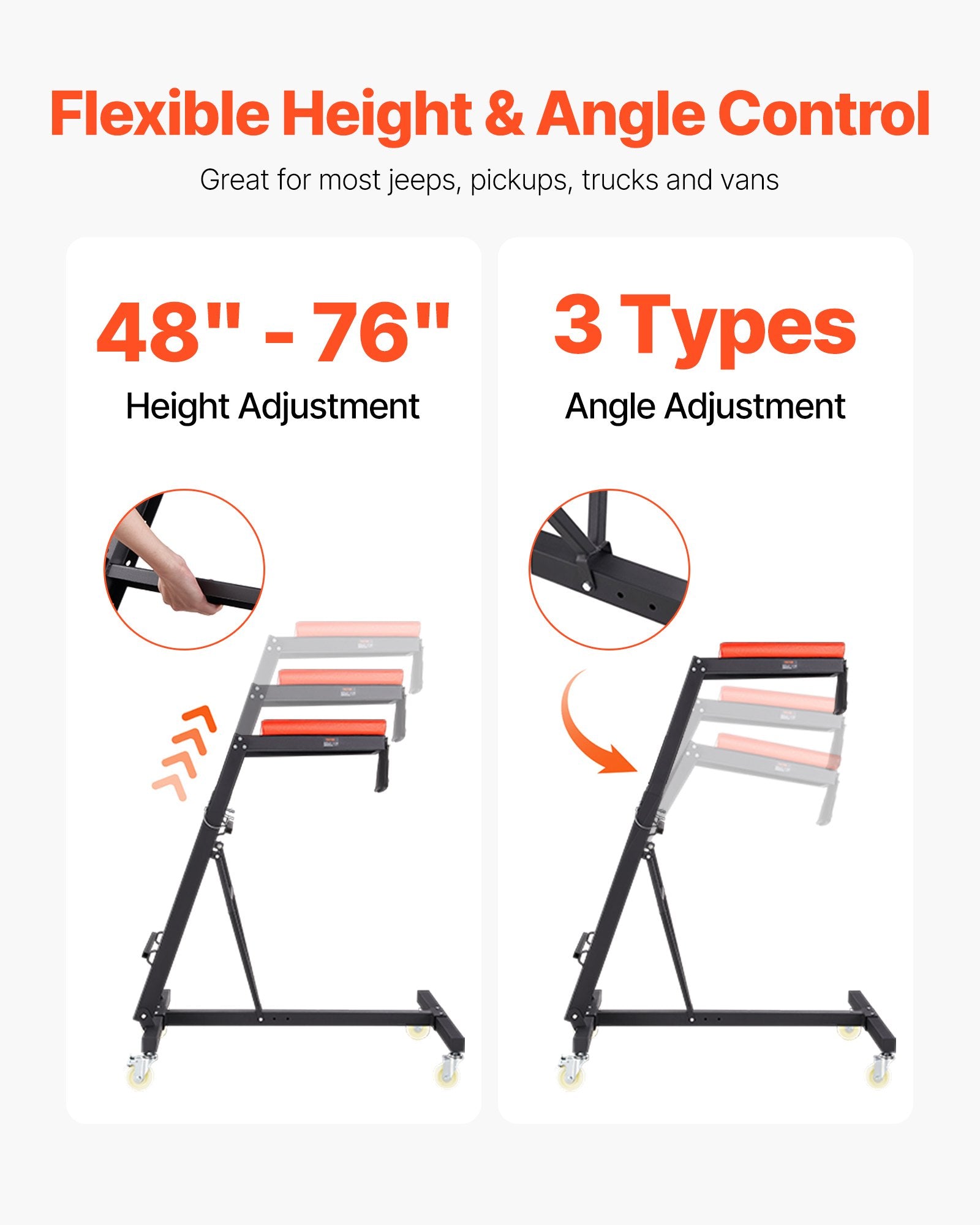 • Flexibla höjdjusteringar: Med en flerstegshöjdjustering från 49,6–75,6 tum (1260–1920 mm) och 3 vinklar, låter vår krypvagn dig arbeta bekvämt utan att anstränga kroppen eller översträcka armarna. Perfekt för reparationer av motorrummet på fordon som jeepar, lastbilar, pickuper med mera.