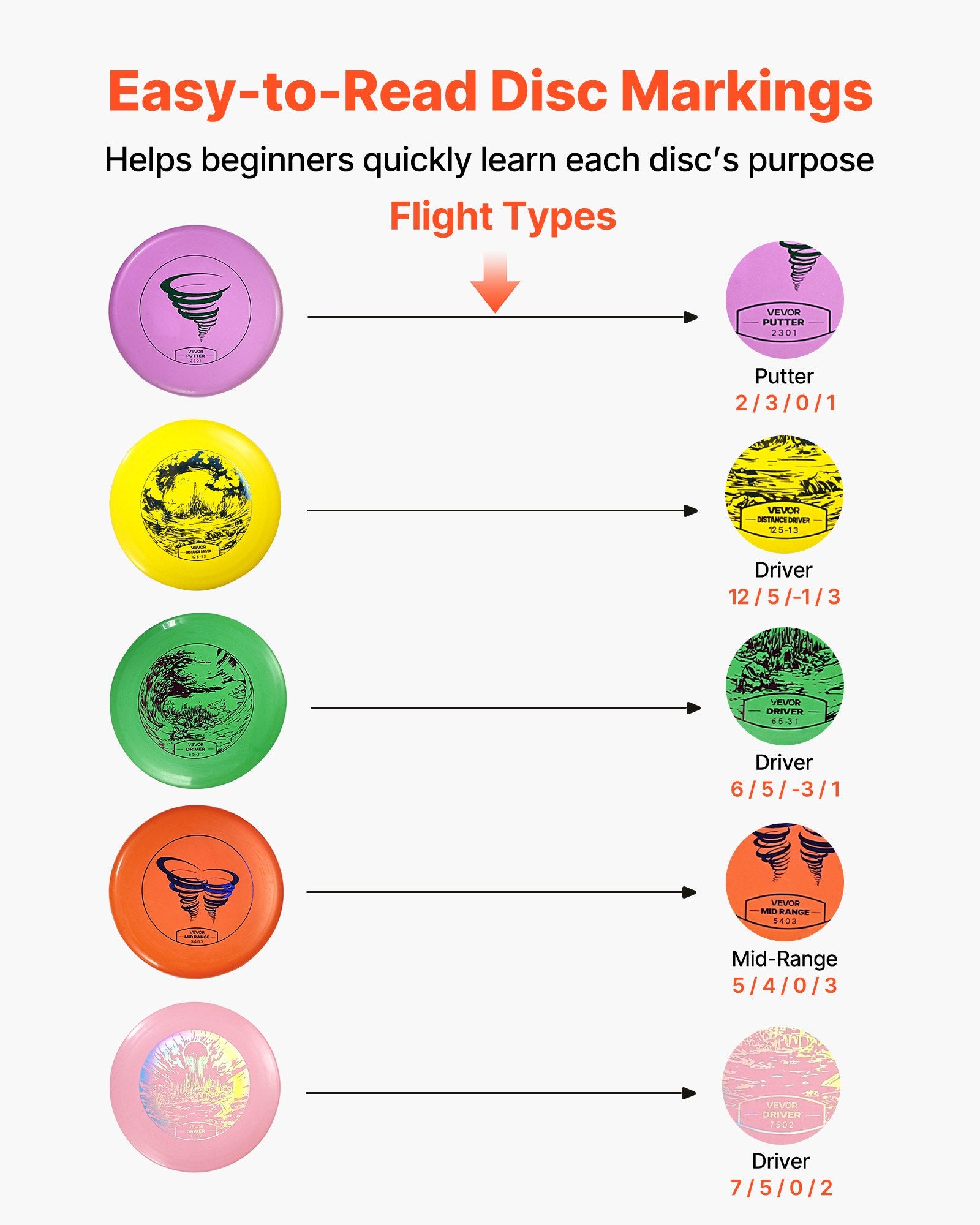 - Tydlig grafik och etiketter: Varje skiva har tryckta mönster och text som hjälper nybörjare att snabbt förstå grunderna i discgolf. Lämplig för både nya och erfarna spelare som vill förbättra sina färdigheter.