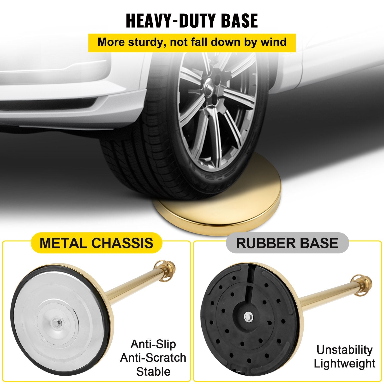 - Robust bas: Denna 30 cm stabila bas är fylld med kraftig betong, som är tillräckligt stark för att stå emot stark vind och inte lätt tryckas ner av folkmassor. Dessutom är metallchassit utformat för maximalt skydd mot golvskrapning och själva stolpen.