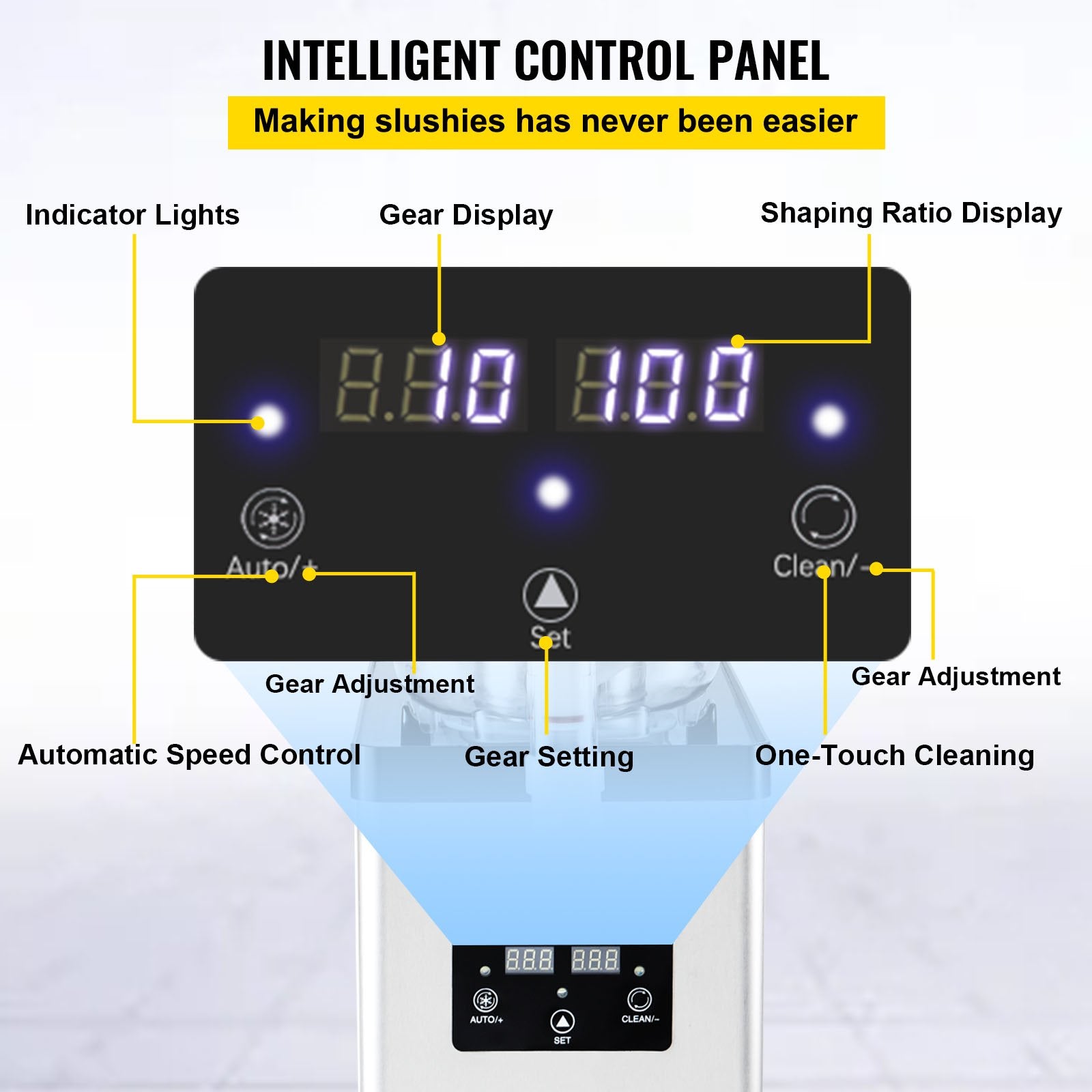 - Exakt kontrollområde: En kort kontrollpanel garanterar enkel användning för den kommersiella slushiemaskinen. Med en enkel knapptryckning har du din favoritfrysta dryck redo att slurpas av. Två digitala displayer gör det enkelt att se växel och formningsförhållanden. Det automatiska rengöringsläget är också tillgängligt för att spara ansträngning.