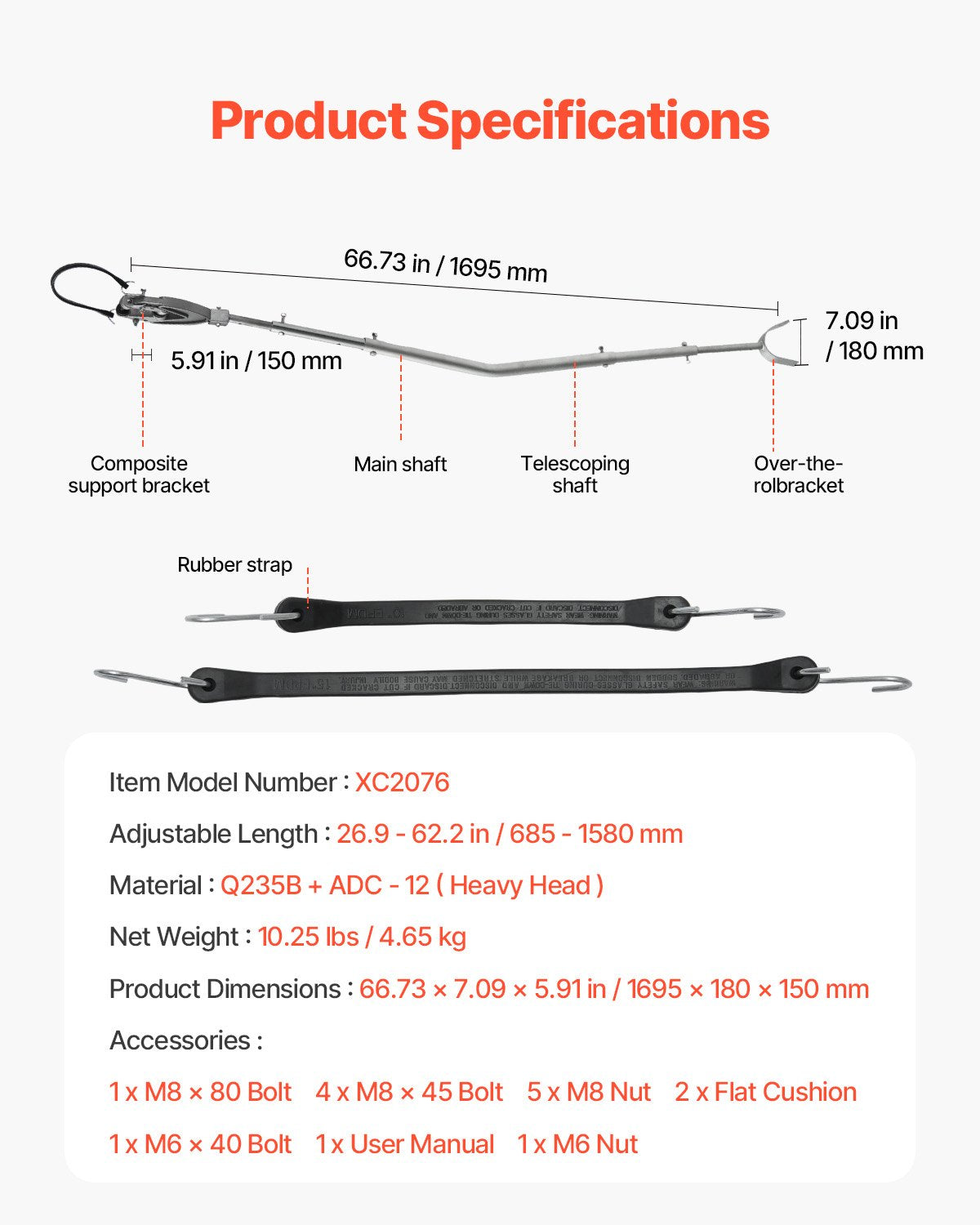 - Justerbar längd: Akterskyddets längd kan justeras från 74 till 150 cm, vilket kan användas för en mängd olika motorbogseringsmetoder. Obs: Du kan mäta avståndet mellan motorn och släpvagnen före användning.