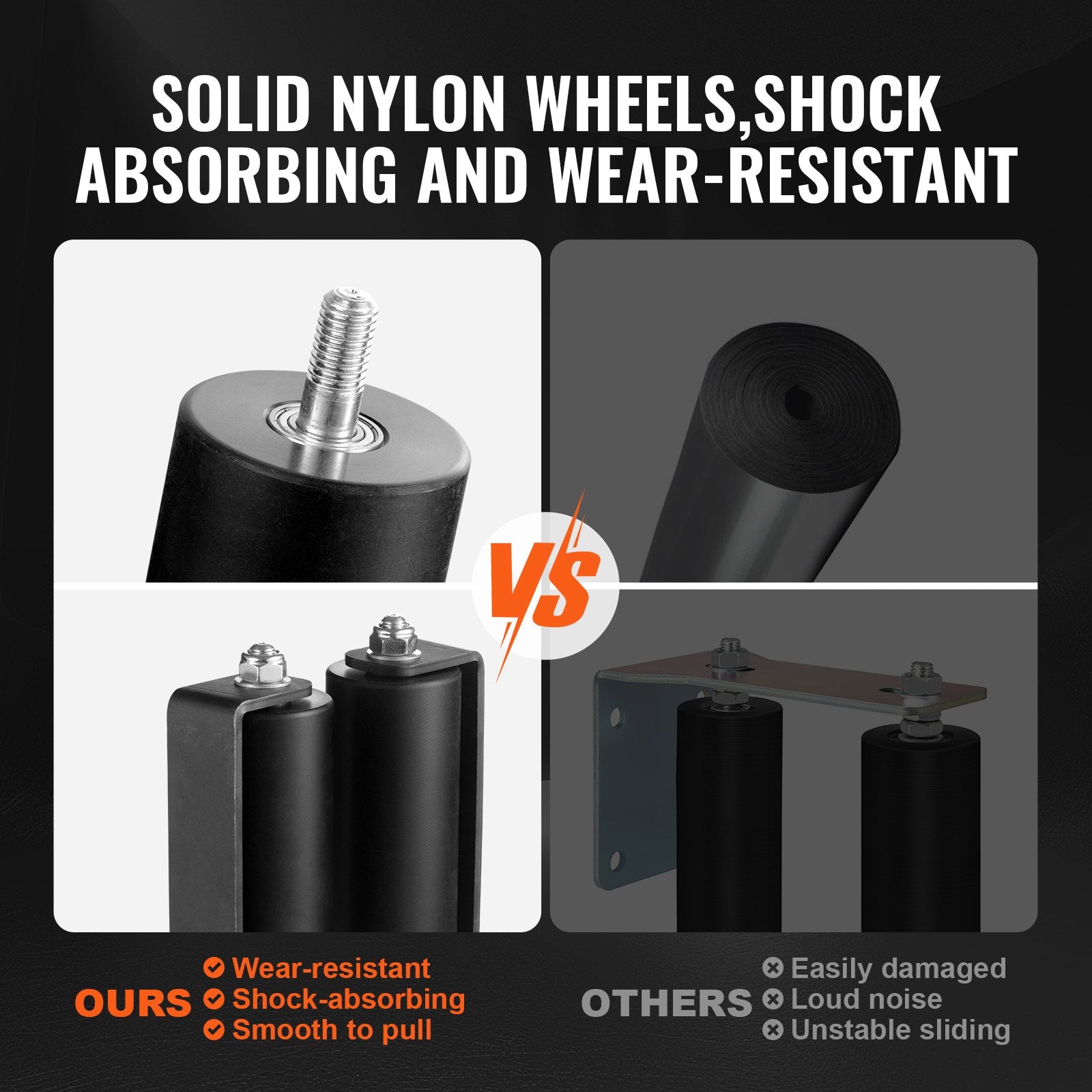 - Mångsidig kompatibilitet: De två nylonhjulen är flexibla vid installation och passar enkelt till en mängd olika populära skenor, dörrkarmar och stolpsystem på marknaden för att möta dina olika behov.