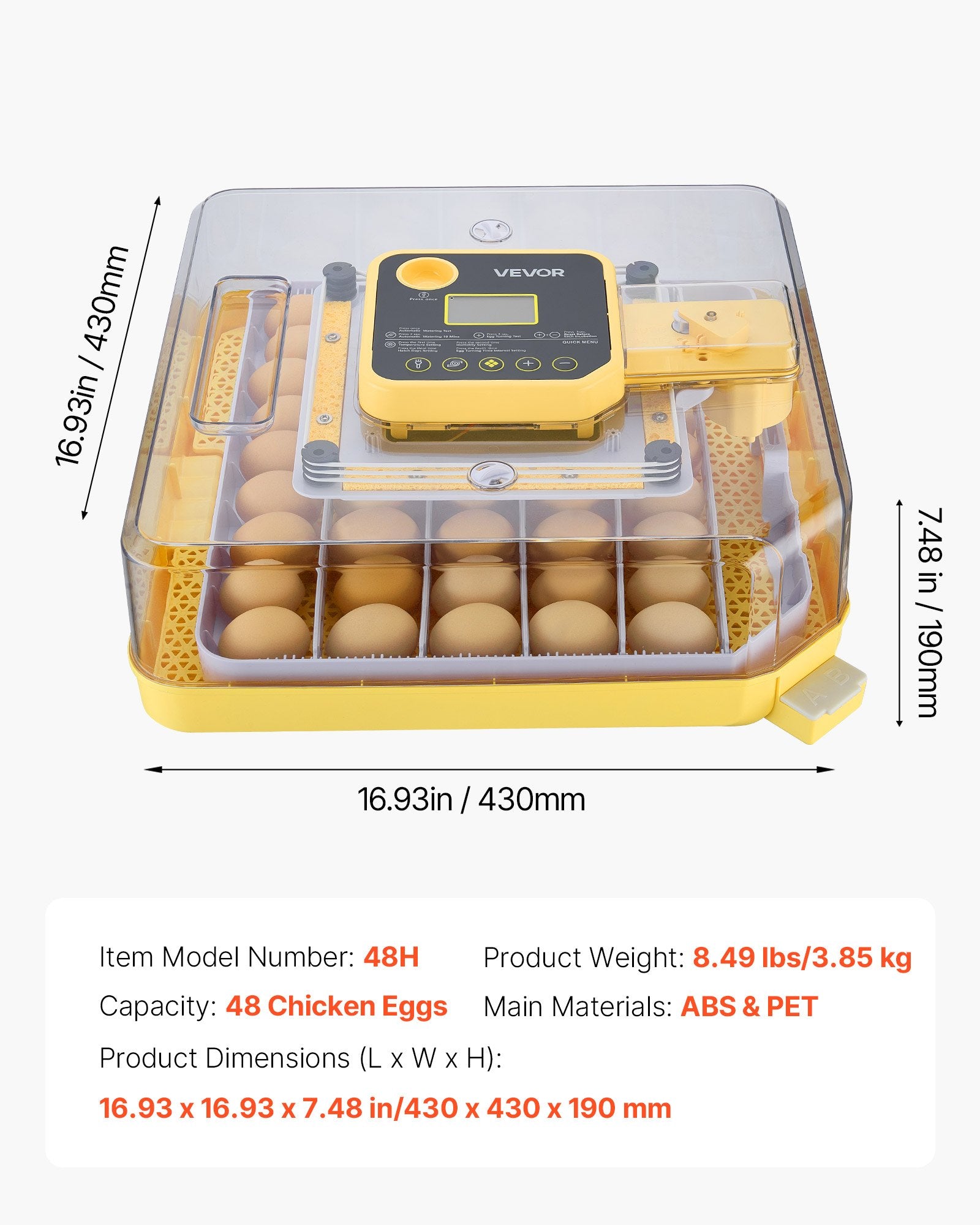 - Adjustable Egg Spacing: Fitting various egg types, our duck egg incubator can hold up to 48 chicken eggs, 36 duck eggs, 12 goose eggs, or 144 smaller eggs, such as quail eggs