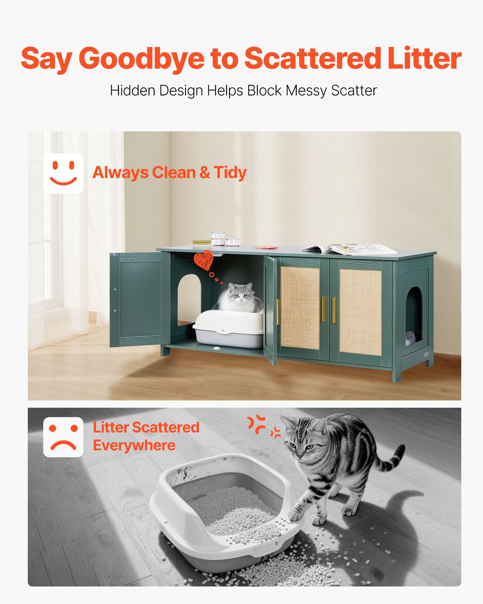 Kattlåda för flera katter, 120 cm dold kattlåda med 4 rottingdörrar och 2 ingångar, inomhuskattrum, kattmöbler i trä, passar de flesta kattlådor, grön