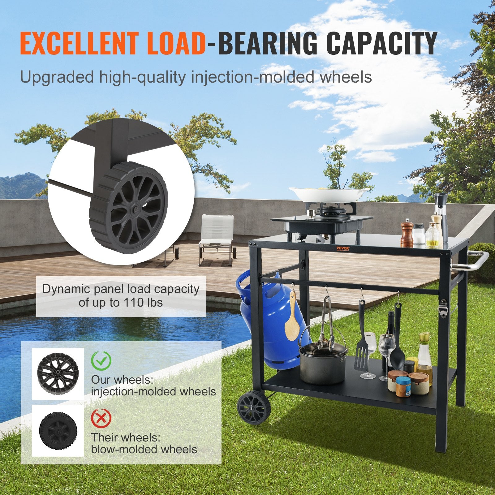 Grillvagn för utomhusbruk med dubbla hyllplan, flyttbart grillbord för matlagning, multifunktionell järnbordsskiva, bärbara modulära vagnar för pizzaugn, arbetsbord med 2 hjul, bärhandtag, svart