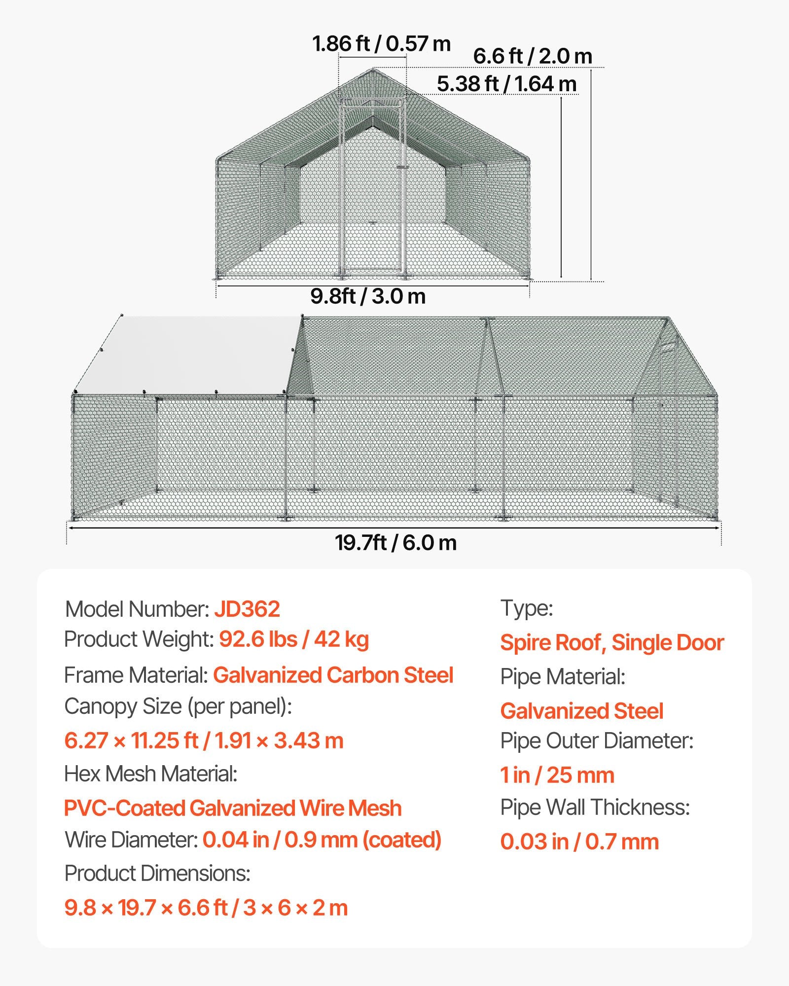 - Spacious Living Area: Offering a generous 9.8x19.6x6.5 ft of space, this metal chicken run features four-sided ventilation, creating a healthy and comfortable environment. The PE-coated canopy provides sun protection, waterproofing, and tear resistance, shielding your poultry from external elements.