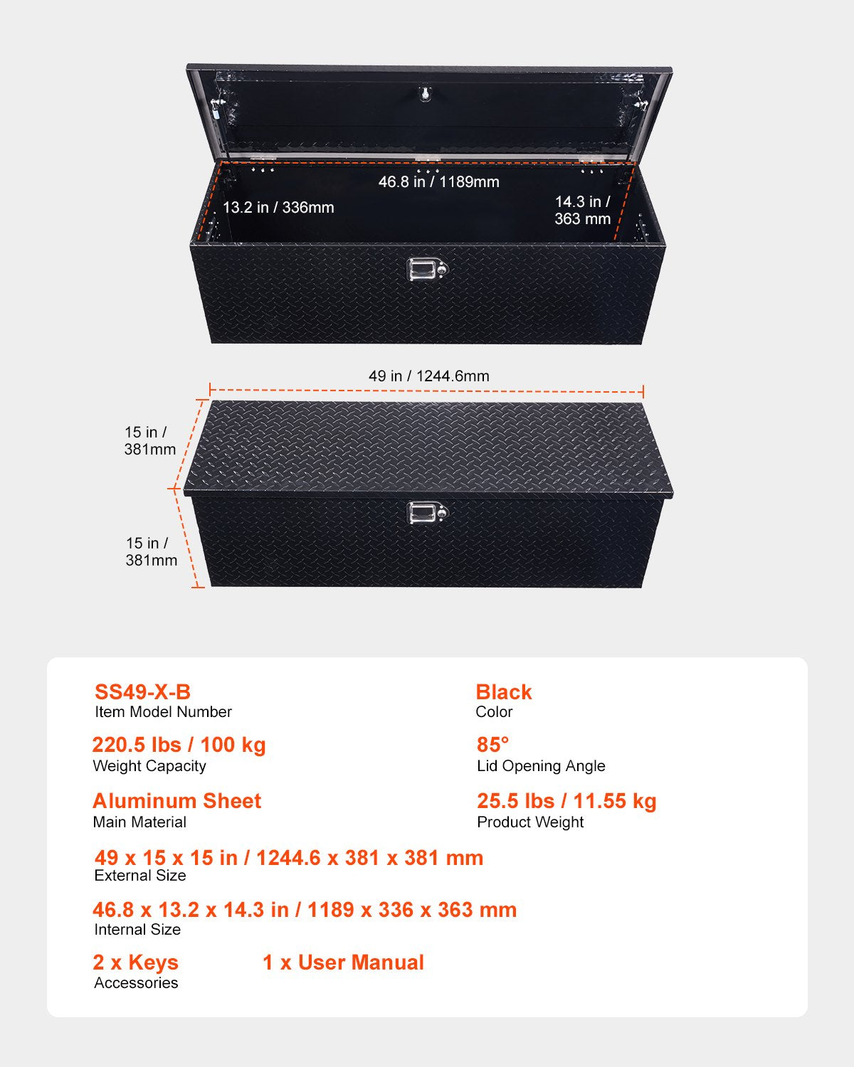 Kraftig verktygslåda i aluminium för lastbilsflak, diamantplåtsverktygslåda med sidohandtag och låsnycklar, förvaringslåda för släpvagn, pickup, husbil, 49"x15"x15"(1244,6x381x381mm), svart