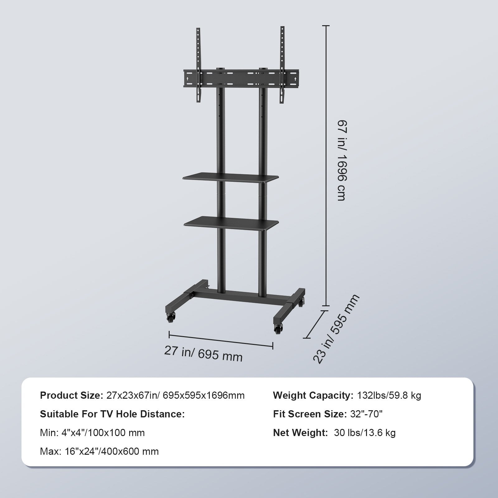 - Universell kompatibilitet: Vårt höga TV-stativ är utformat för att tillgodose dina behov och passar 32–70-tums TV-apparater med en viktkapacitet på upp till 59 kg. VESA-måtten sträcker sig från 100 mm x 100 mm till 600 mm x 400 mm, vilket gör den kompatibel med de flesta TV-märken.