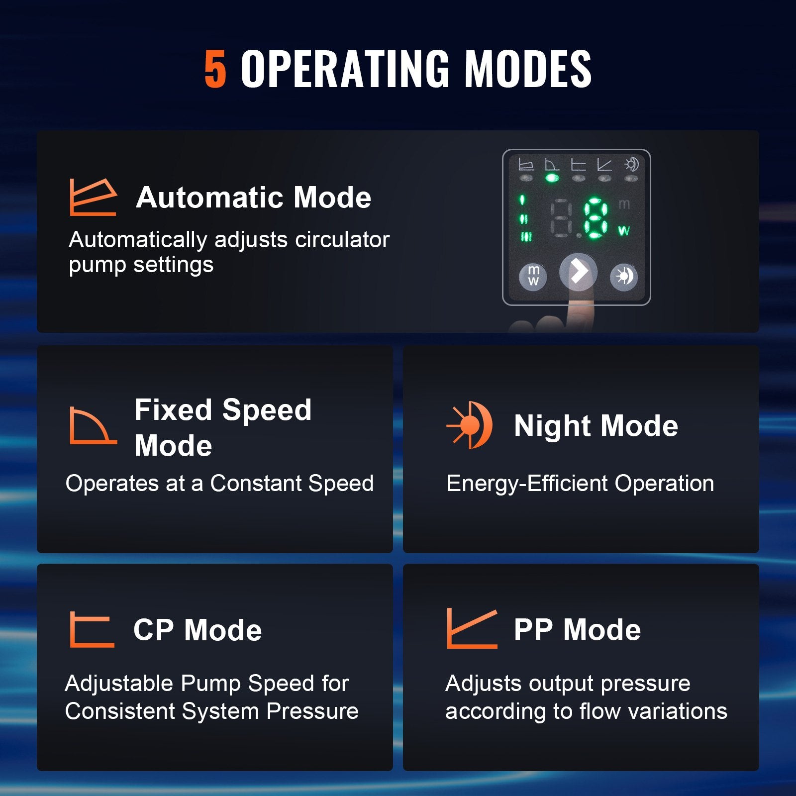 - Intelligenta styrlägen: Utrustad med fem smarta styrlägen – automatisk, konstant hastighet, konstant tryck, proportionellt tryck och nattläge – justerar denna gjutjärnscirkulationspump automatiskt sin drift baserat på dina behov. Optimera ditt värmesystems prestanda, förbättra komforten och minska energiförbrukningen med skräddarsydda inställningar.