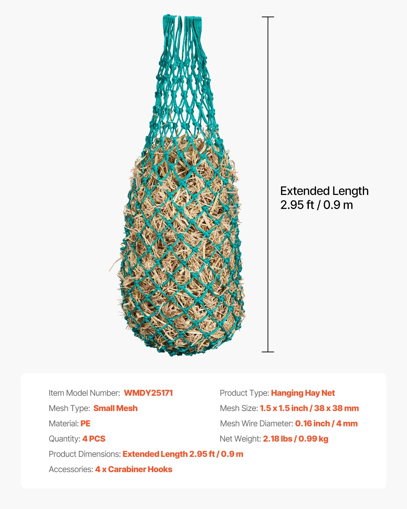 Hay Nets for Horses, 4PCS, 0.9 m Extended Length, 38 x 38 mm Holes, PE Material, with Four Carabiner Hooks, Hanging Slow Feed Hay Nets for Horses, Sheep, Cattle, Alpacas, and Livestock