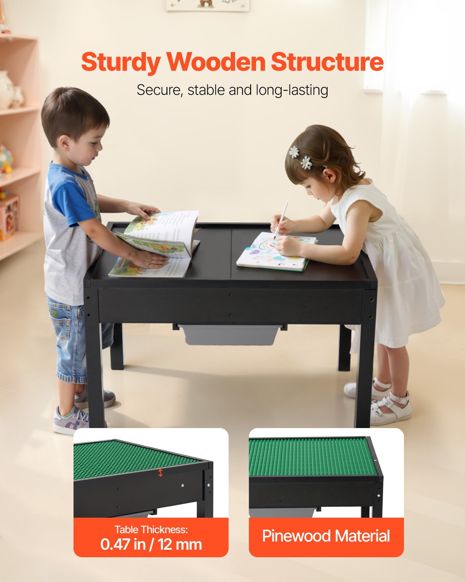 - Säkert och stabilt: Tillverkat av slitstarkt furuträ är detta aktivitetsbord för barn byggt för att hålla! Det har rundade hörn och släta kanter, vilket säkerställer att ditt barn leker säkert medan de njuter av sin tid vid bordet.