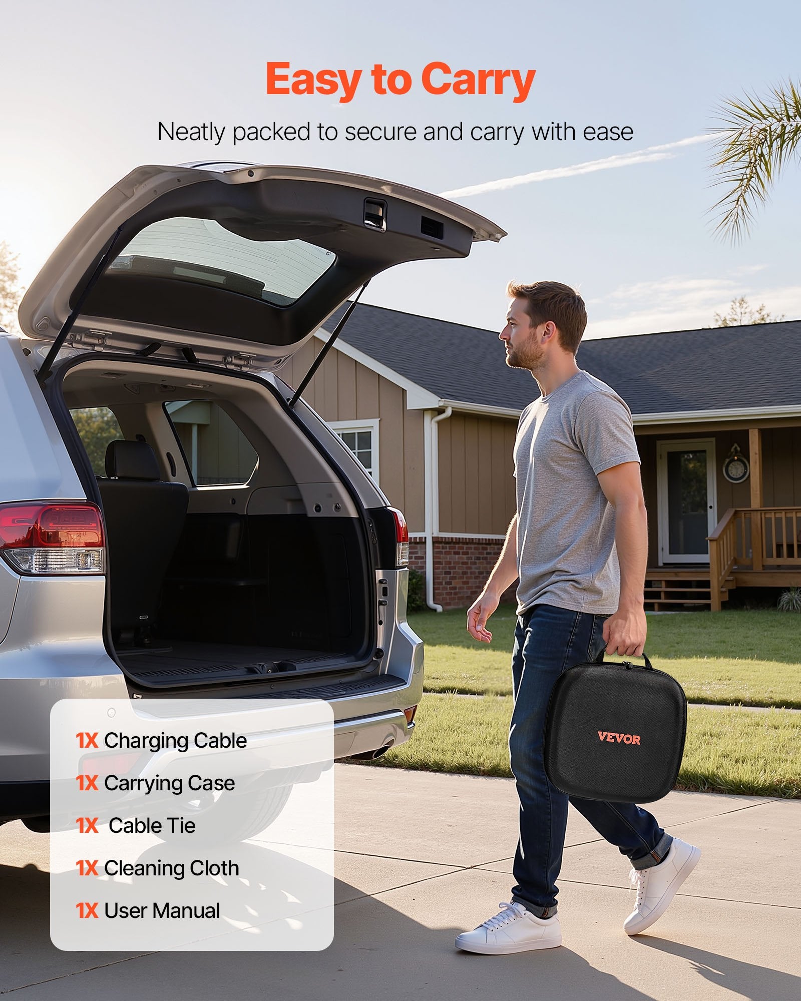 - Levereras redo att användas: Vår förlängningskabel för elbilar inkluderar en bärväska för prydlig förvaring, en rengöringsduk för att hålla kontakterna dammfria och ett buntband för enkel sladdhantering – allt du behöver i ett kit