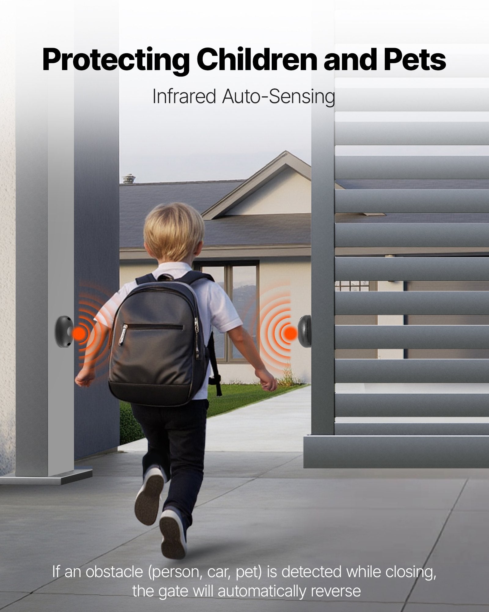 - Smarta säkerhetsfunktioner: Den automatiska grindöppnaren är utrustad med infraröda sensorer. När den infraröda sensorn detekterar en person eller ett fordon, reverserar grinden automatiskt för att förhindra oavsiktliga kollisioner och garanterar säkerheten för dina barn och husdjur.