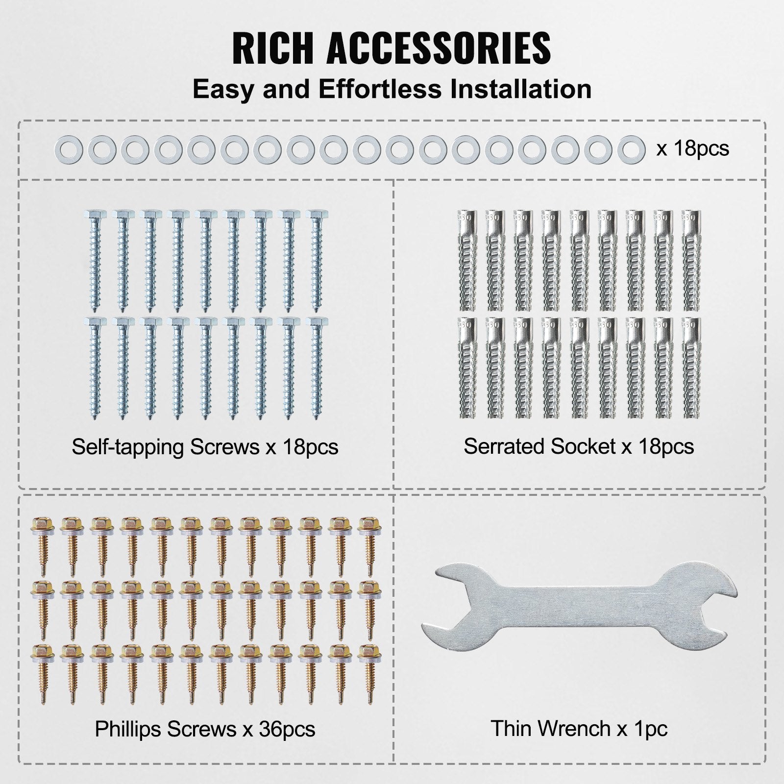 - Komplett tillbehörssats: Satsen innehåller en komplett uppsättning tillbehör: Svalstjärtsskruvar M525 (36 st), tunn nyckel M8 med öppen ände 14 (1 st), tandade hylsor M8 (18 st), självgängande skruvar M860 (18 st). Installationen är enkel och problemfri.