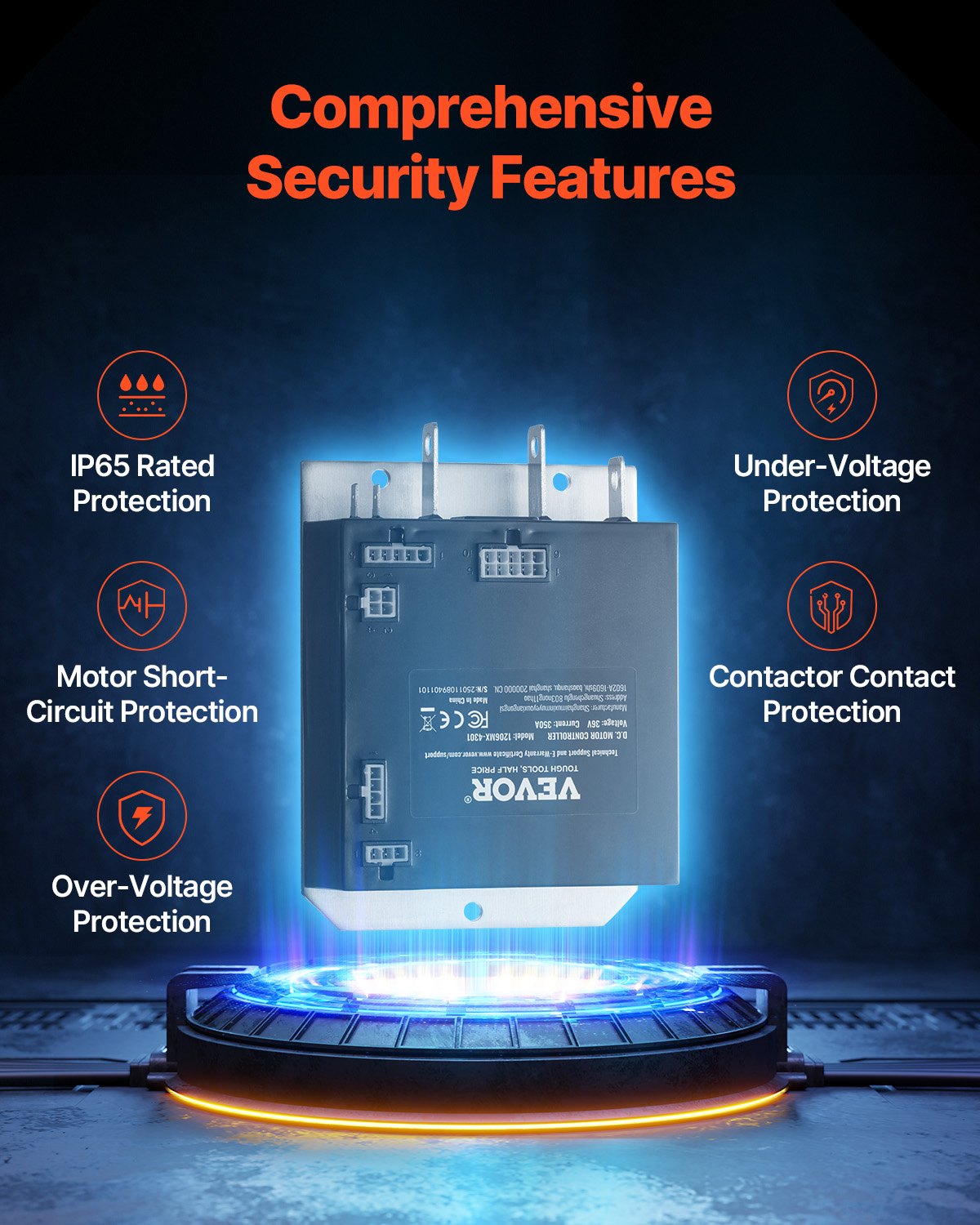 - Allroundskydd: Denna golfbilskontroll har inbyggt skydd mot motorkortslutning, överspänning, underspänning, kontaktorkontakt och temperatur. Vattentätheten är IP65 och passar för tuffa väderförhållanden och krävande miljöer, vilket garanterar säker och pålitlig drift.