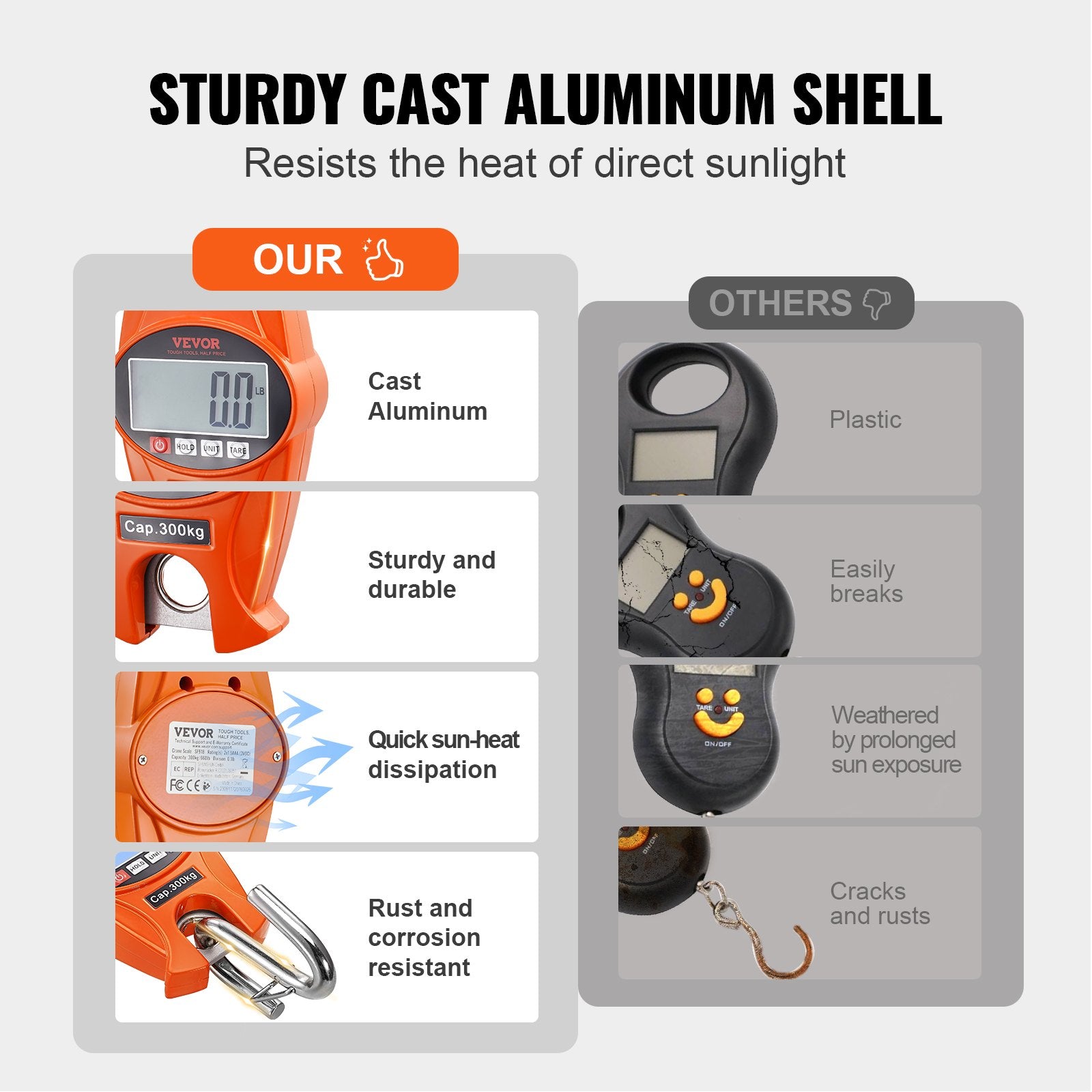Digital kranvåg, 300 kg, industriell kraftig hängvåg med gjuten aluminiumhölje och LCD-skärm, handhållen minikran med krokar för gård, jakt, fiske, utomhusbruk, garage (orange)